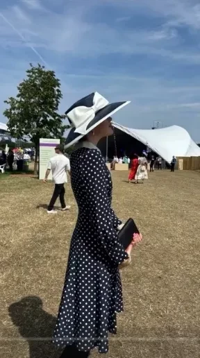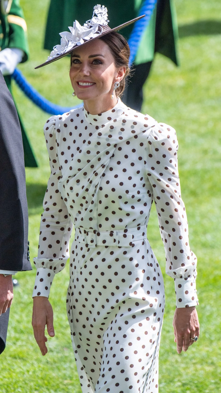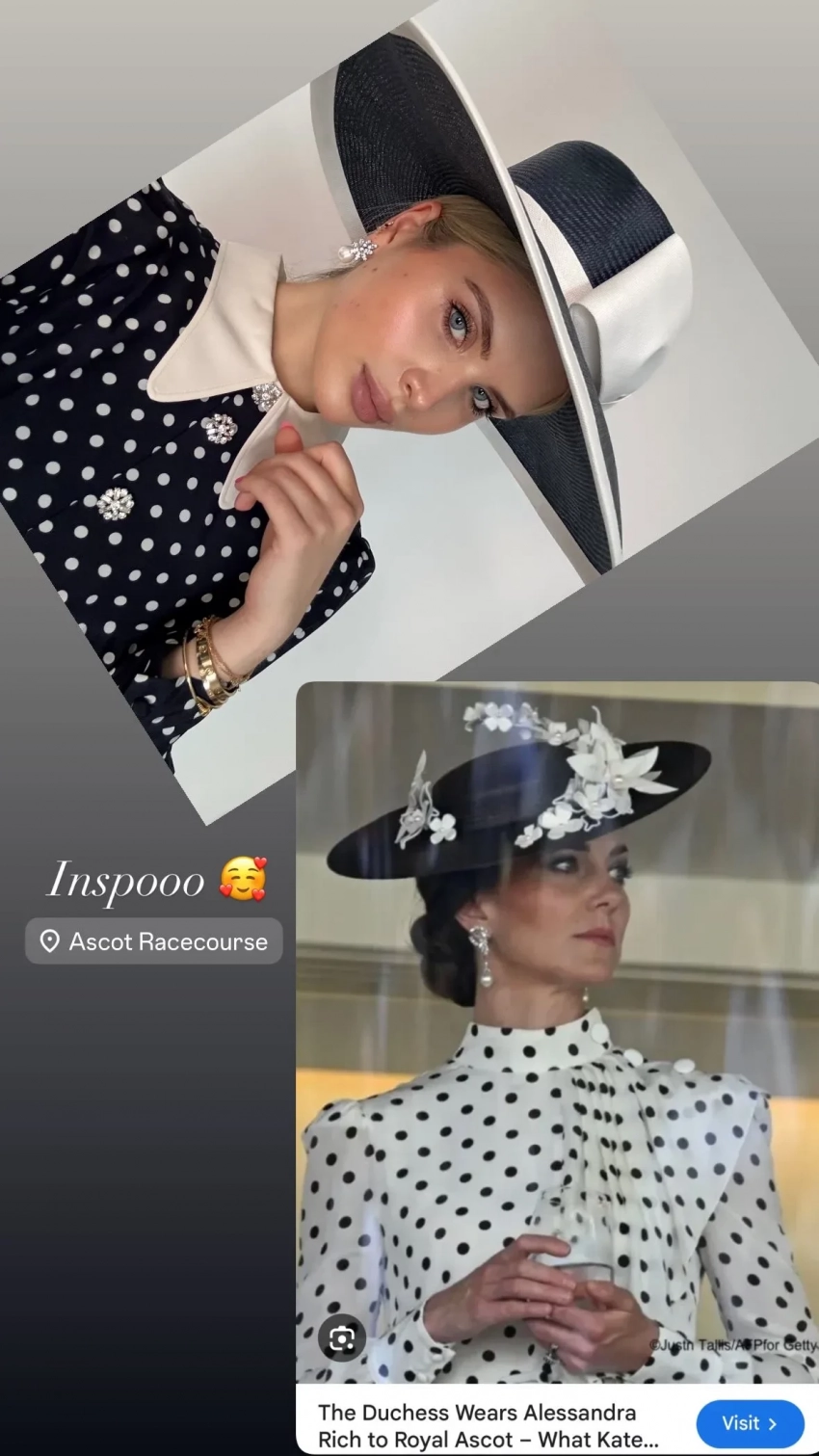 На Royal Ascot 24-летняя Устинья появилась в платье в горошек и чёрно-белой шляпке. При этом в сторис* она опубликовала коллаж со своим фото с мероприятия и снимок Кейт Миддлтон, сделанный на Royal Ascot в 2022 году. "Вдохновение", — подписала коллаж Устинья, дав понять, что сделала оммаж на супругу принца Уильяма. (Любопытно, что сама Кейт в тот раз скопировала выход принцессы Дианы на скачках 1988 года).
