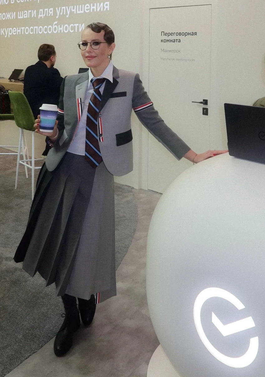 Ксения Собчак приехала в Санкт-Петербург на поезде вместе с мужем Константином Богомоловым. Ведущая в костюме Thom Browne посетила стенд Сбербанка, выступила на сессии о возращении иностранных брендов в Россию и удивилась, что за пару часов на ПМЭФ ещё не встретила ни одной эскортницы. (Ранее сообщалось, что сотни девушек традиционно готовятся приехать на форум).