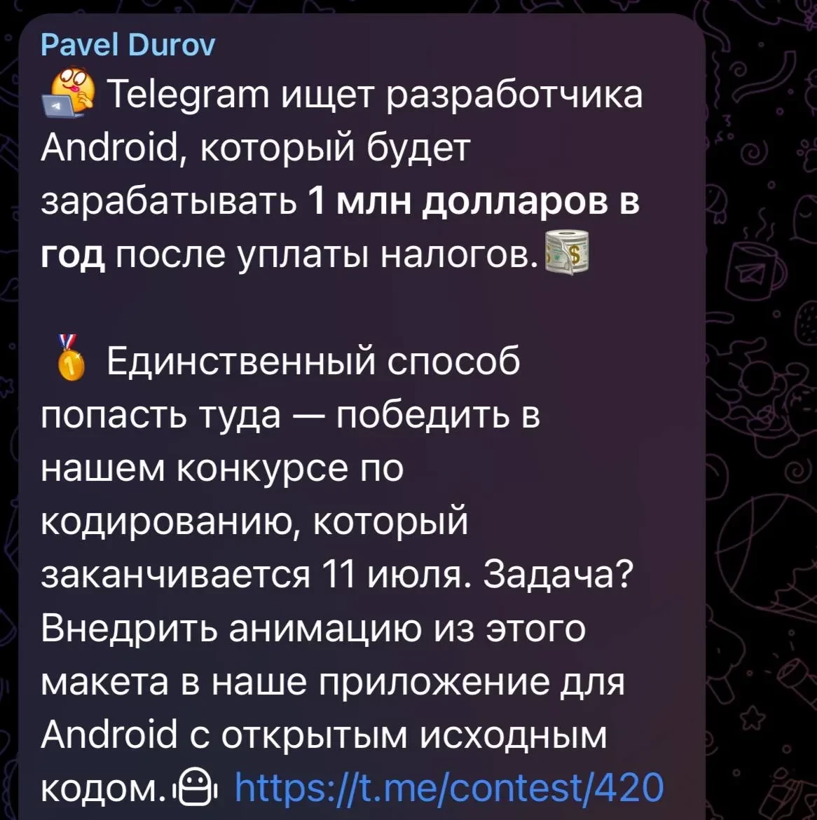 По условиям конкурса, участникам необходимо реализовать анимацию по предоставленному макету и внедрить её в приложение Telegram на Android. Победителю обещают единовременную выплату в размере 50 тыс. долларов, а также предложение о работе с зарплатой 1 млн долларов в год после уплаты налогов. Конкурс открыт для всех желающих и продлится до 11 июля, 23:59 по дубайскому времени.