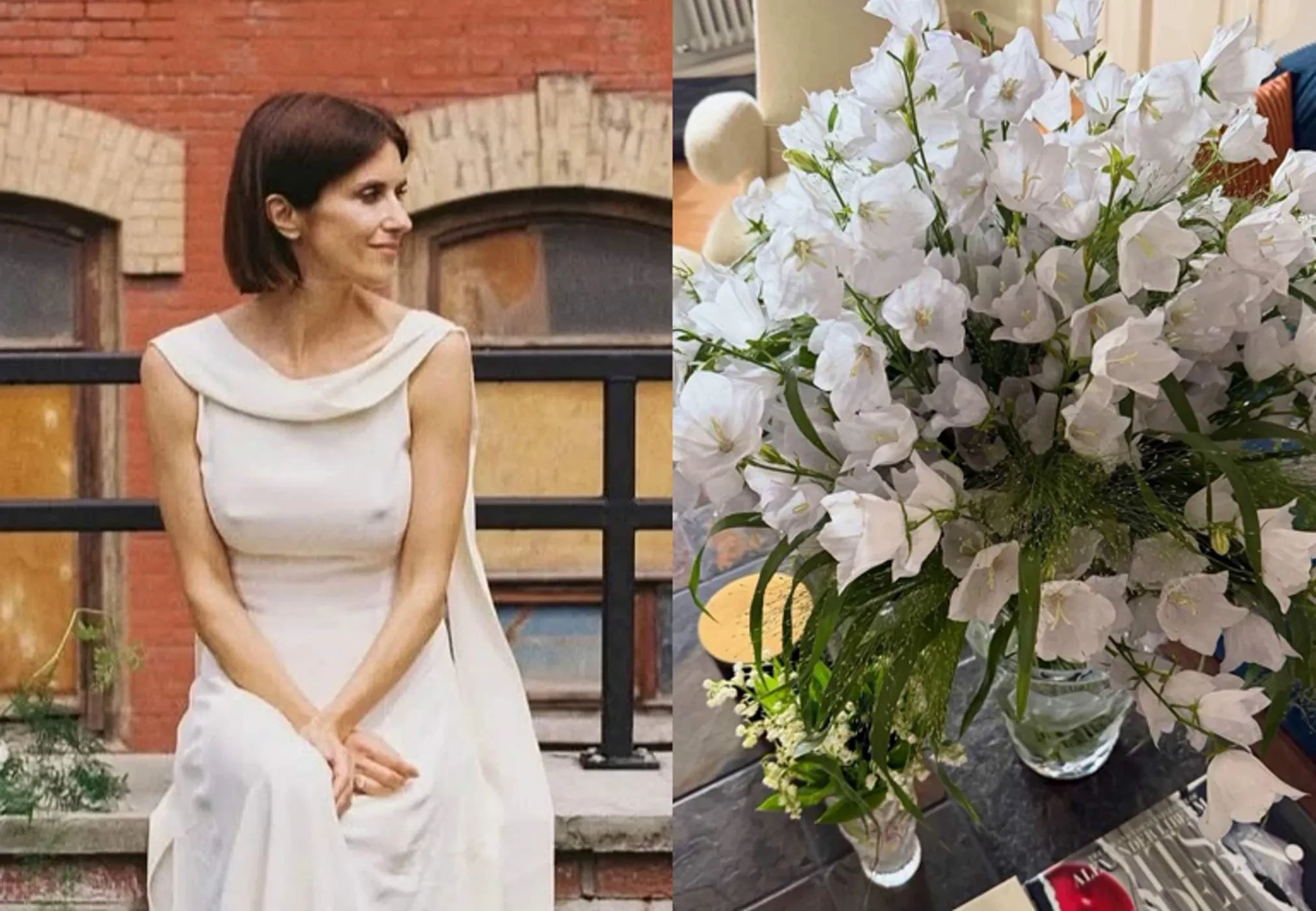 На снимках можно увидеть саму Ксению в свадебном платье Prada, а также букет невесты вблизи и (частично) праздничный стол. Фотографию жениха Соловьёва в подборку не включила.