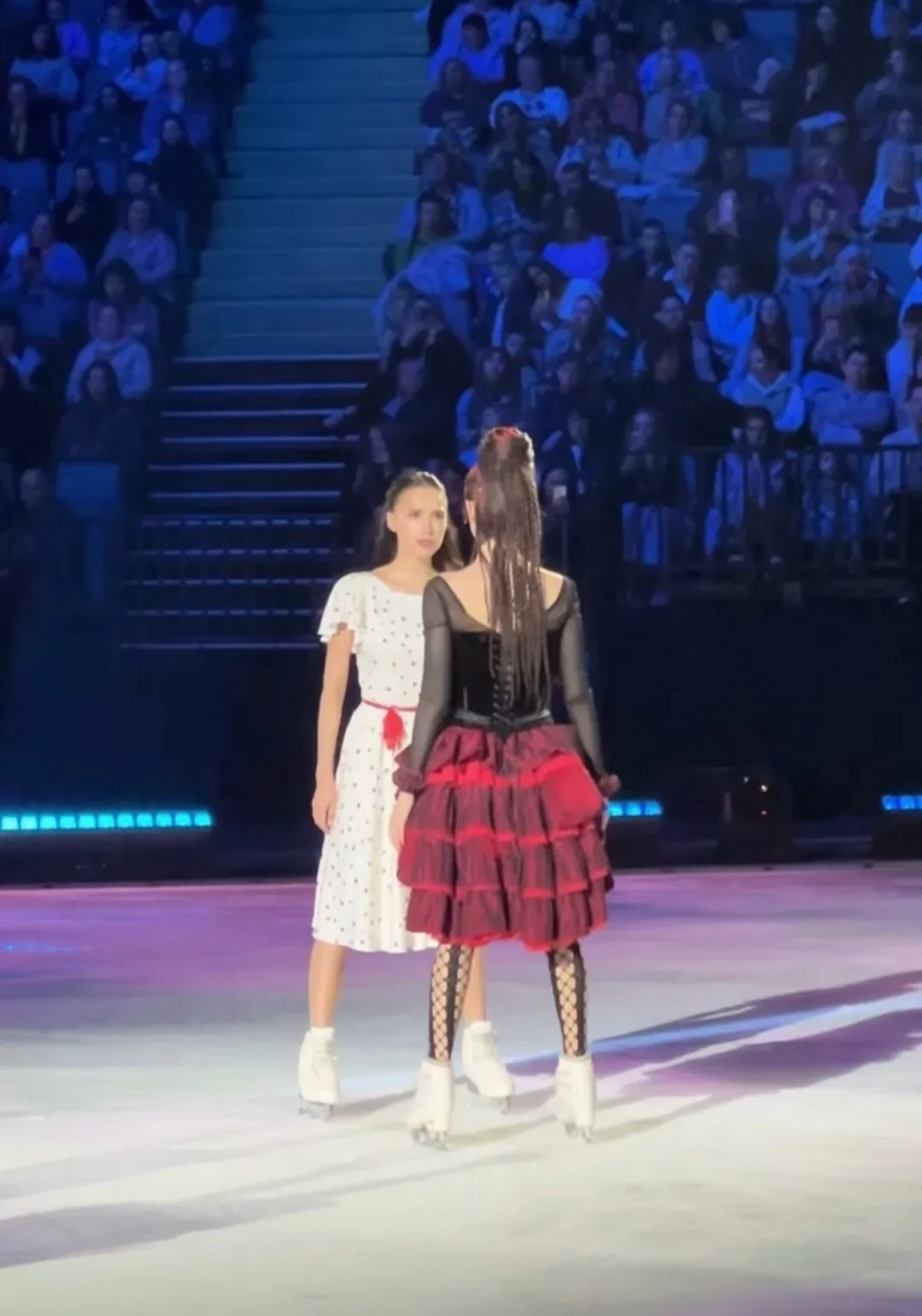 23-летняя Алина Загитова и 25-летняя Евгения Медведева вместе вышли на лёд и станцевали номер под песню “Ты прости меня”.