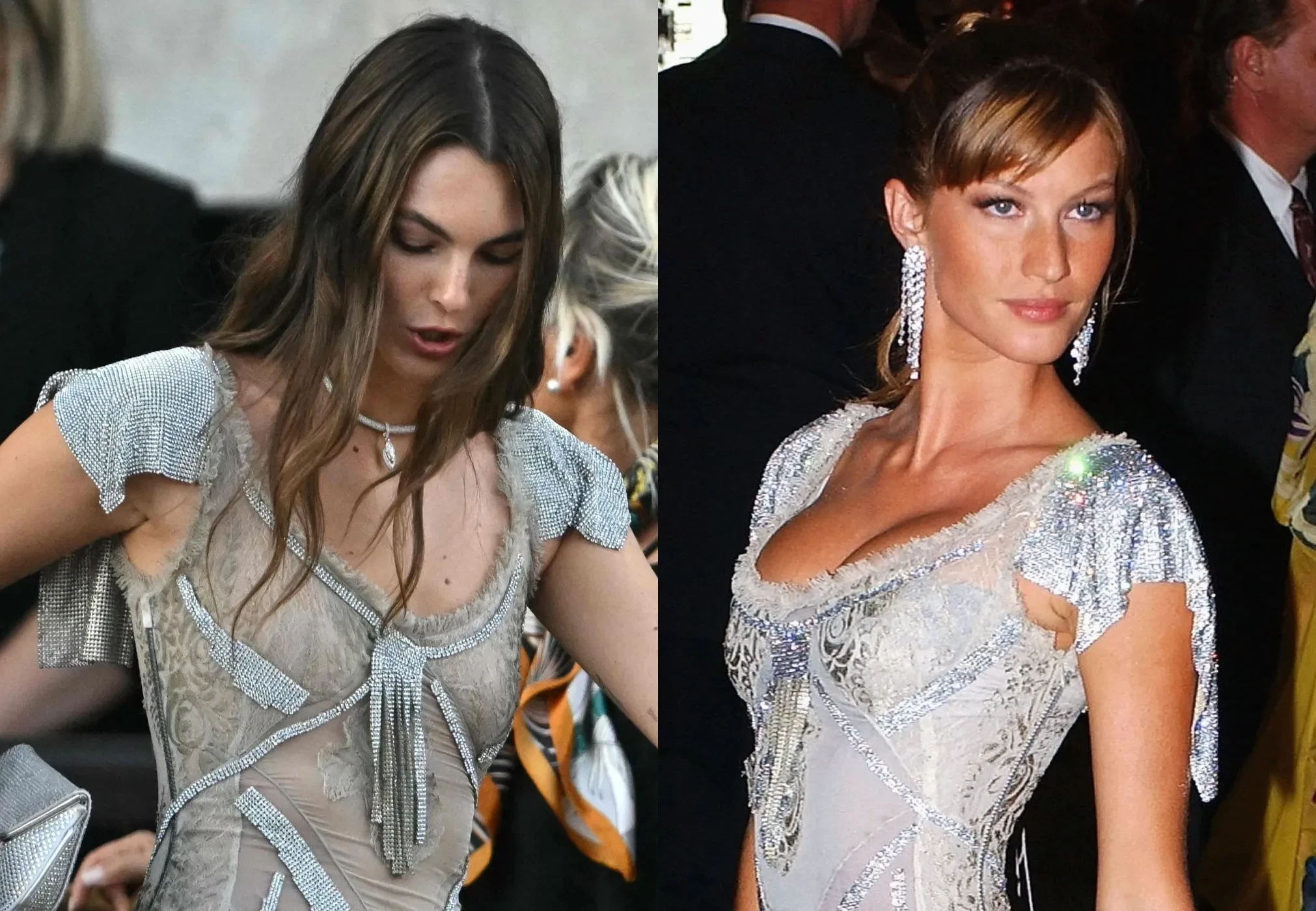 Виттория Черетти, июнь 2025 годаЖизель Бундхен на Met Gala в 2003 годуЖизель Бундхен на Met Gala в 2003 годуНынешняя возлюбленная голливудского актёра поделилась в соцсетях, что на вечеринке случайно (или нет?) порвала винтажное платье, но почему выбрала именно этот наряд для выхода в свет — она не рассказала. Возможно, модель была в курсе истории платья и специально надела его с расчётом на обсуждения в соцсетях. По ещё одной версии, Жизель оставила ДиКаприо некоторые свои вещи после разрыва с ним в 2005 году, а Черетти просто нашла у него платье и решила дать ему вторую жизнь. Как бы то ни было, в соцсетях обсуждают, что это было: "тонкий троллинг" или безобидная шутка.