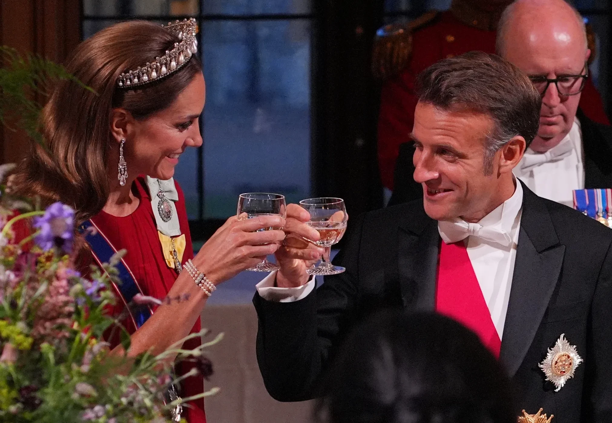 Кейт Миддлтон и принц Уильям, король Карл III и королева Камилла на государственном банкете в честь визита Эммануэля Макрона