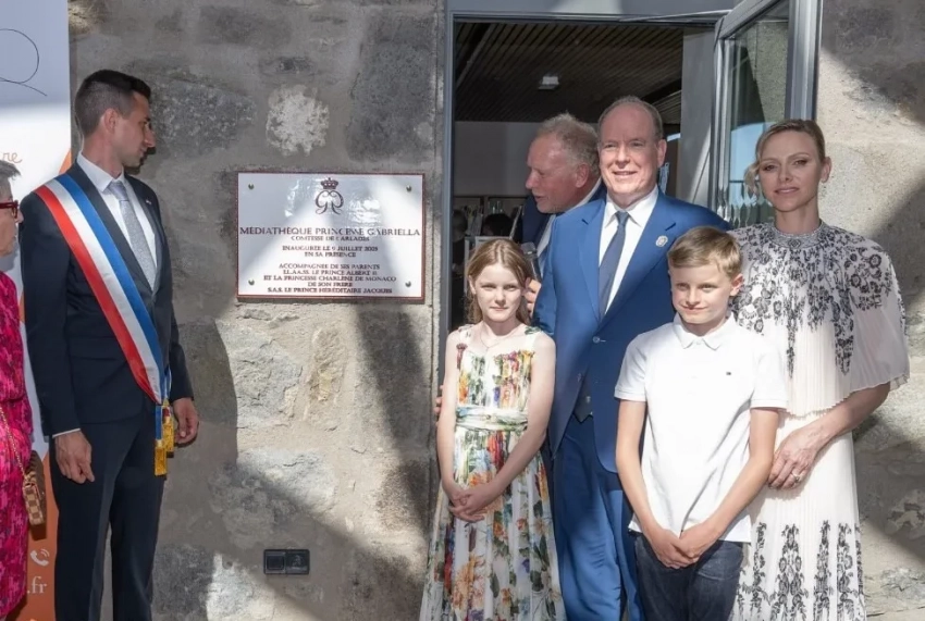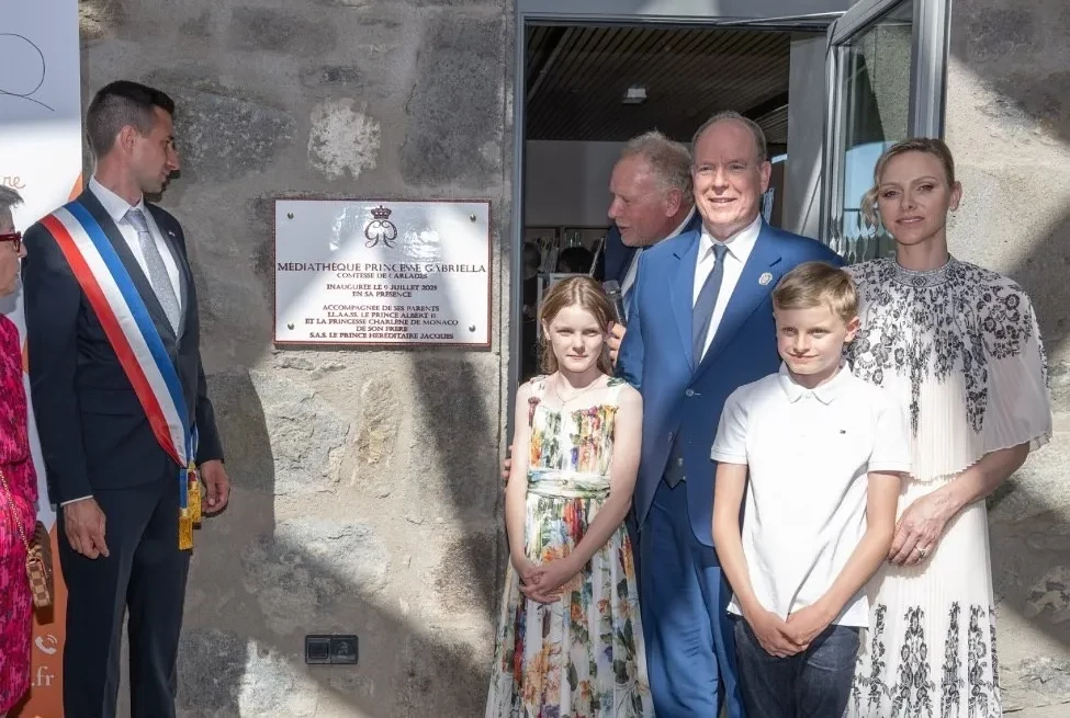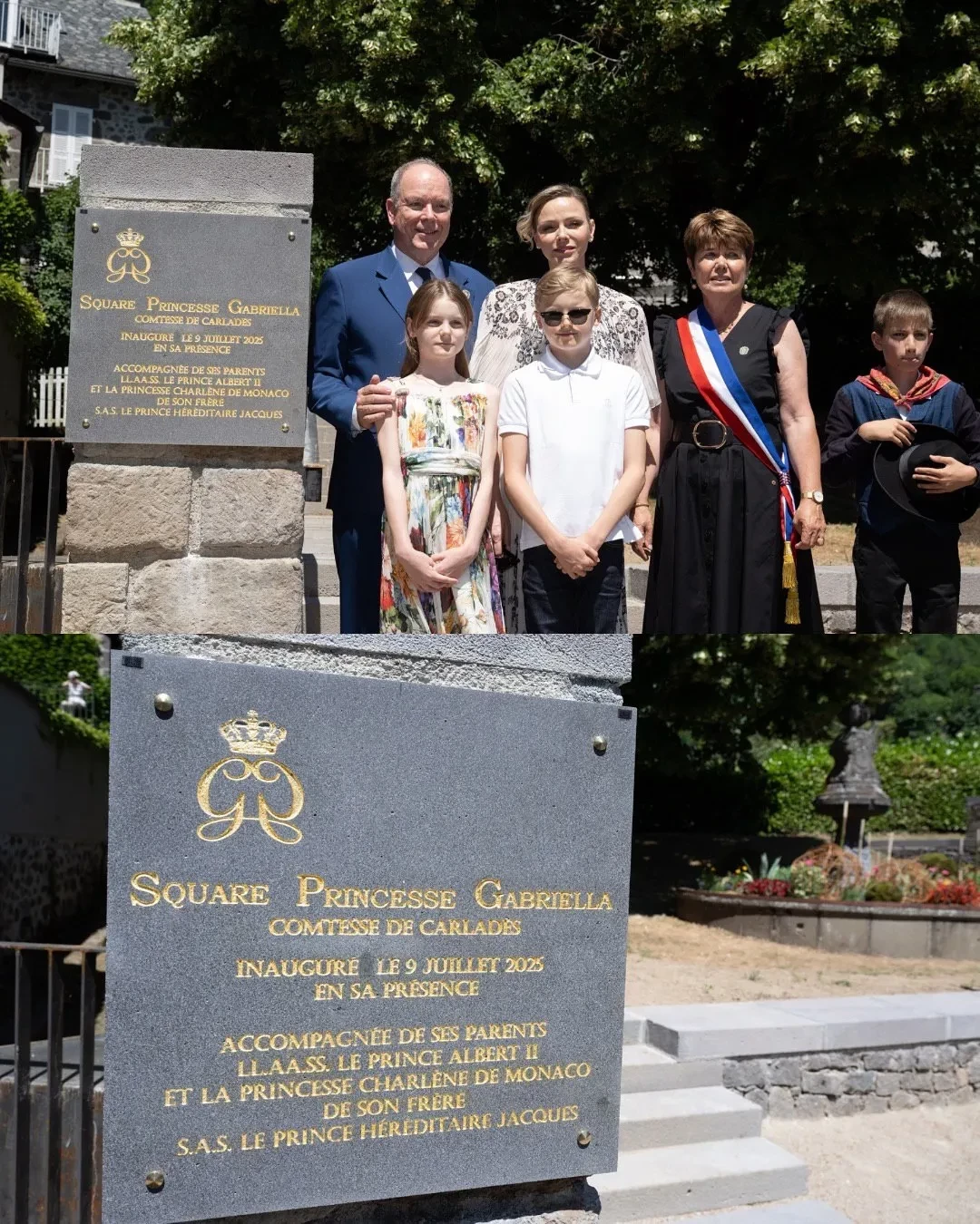 Княгиня Шарлен и князь Альбер с детьми на открытии площади принцессы ГабриэллыКнягиня Шарлен и князь Альбер с детьми, Анн Дельрье на открытии площади принцессы ГабриэллыКнягиня Шарлен и принцесса ГабриэллаПосле этого монархи отправились в коммуну Мюр-де-Баррес, где принцесса Габриэлла вместе со своими родителями и братом открыла медиатеку своего имени, а в деревне Канталь в честь принцессы открыли ботанический сад. Шарлен и Альбер сделали семейное фото с детьми возле дерева, под которым в 1912 году была сфотографирована бабушка князя, принцесса Шарлотта. Габриэлла запечатлена с этим фото в руках.