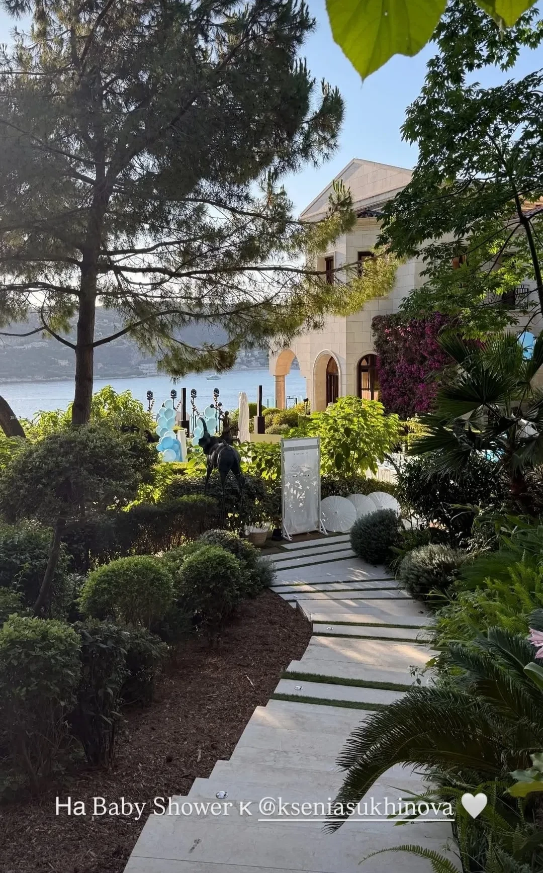 Праздник проходил на Лазурном Берегу, на курорте Сен-Жан-Кап-Ферра́ на юго-востоке Франции. Среди прочих, его посетила журналистка Алёна Бердова, она же поделилась фотографиями с мероприятия. Судя по декорациям на вечеринке: голубые шары, цветы и посуда на столах, Ксения ждёт мальчика. Платье на Сухиновой тоже было нежно-голубого цвета.