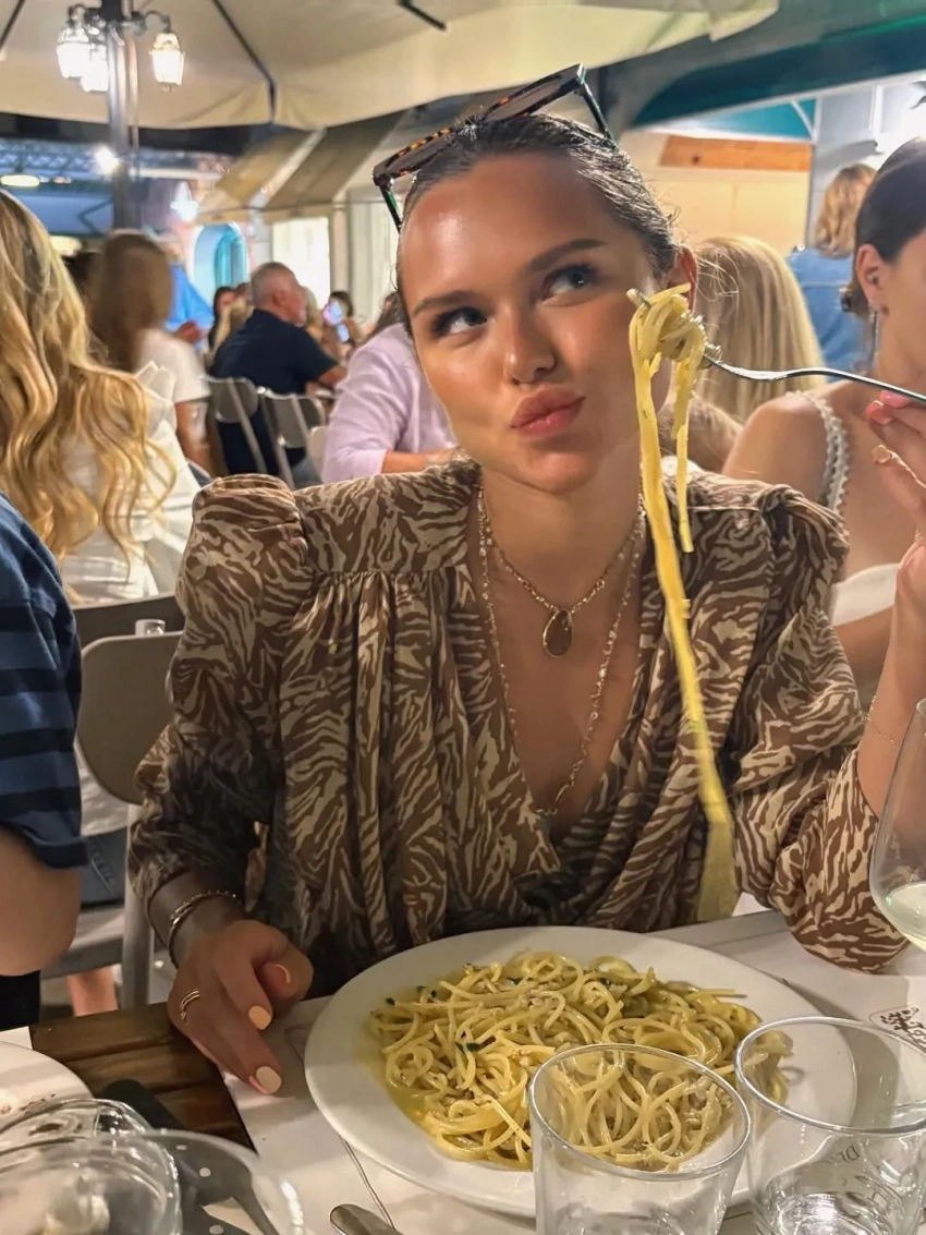 На отдыхе инфлюенсер и основательница бренда одежды Dress by Stesha выгуливает модные образы, катается на велосипеде по итальянскому курорту в платьях и на каблуках, ест пасту в компании родителей и семилетнего брата Марка, делает покупки в бутике Prada и просто наслаждается отпуском.