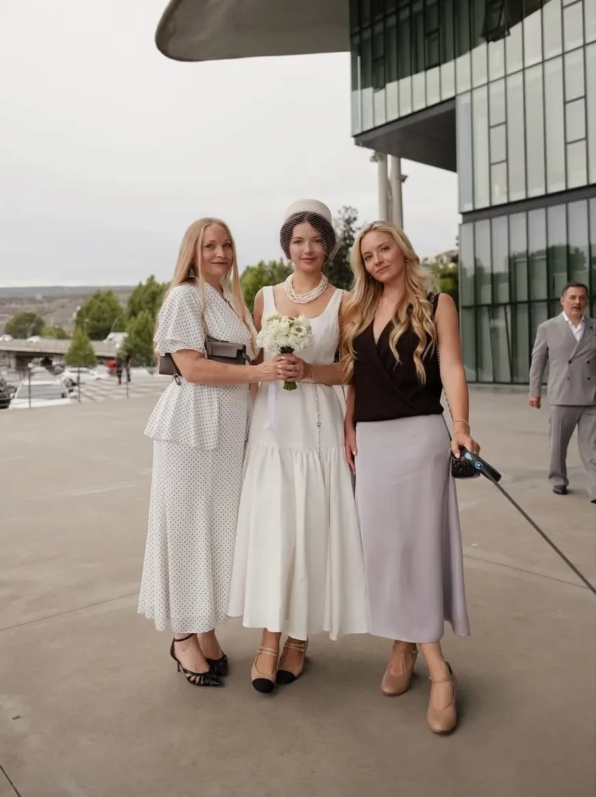 Молодожёны вместе с семьёй невесты: отцом Теймуразом, матерью Натальей и сестрой Марикой собрались на регистрации брака в Доме юстиции в Тбилиси. София надела белое платье российского бренда Roseville[b][/b]и шляпу с вуалью, дополнив образ жемчужным ожерельем, сумкой и поясом Chanel.