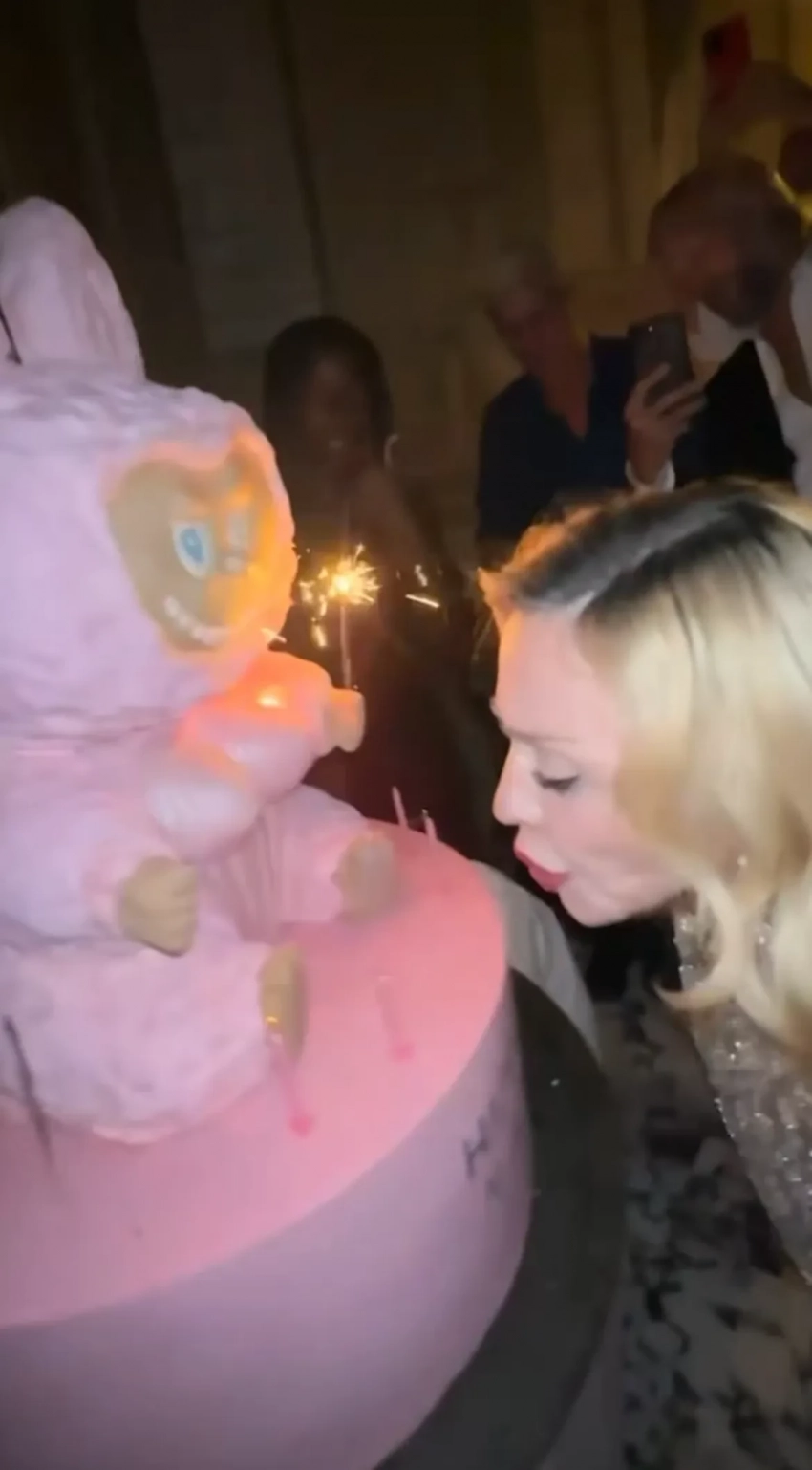 МадоннаМадонна с детьми Рокко, Стеллой и ЭстерМадонна с детьми и бойфрендомФото МадонныМадонна с детьми Рокко, Мерси и ЛурдесСам праздник звезда отметила шумной вечеринкой, на которой собрались её друзья, бойфренд Аким Моррис и дети: 28-летняя дочь Лурдес, 25-летний сын Рокко, 19-летний Дэвид Банда, 19-летняя Мерси и 13-летние близнецы Стелла и Эстер. Певица предстала перед гостями в шёлковом тренче и платье, которое позже сменила на кружевной корсет. Она дополнила образ красной помадой на губах и кружевными перчатками. Праздничный торт у звезды был необычный — в форме популярной этим летом игрушки Лабубу, на котором было написано "С днём рождения, Мадуду".