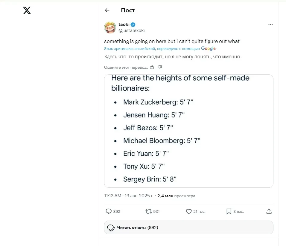 Скриншот поста в XДжефф БезосМарк Цукерберг (в центре)Стоит отметить, что рост самого богатого человека в мире на данный момент, Илона Маска, составляет 186 см.
