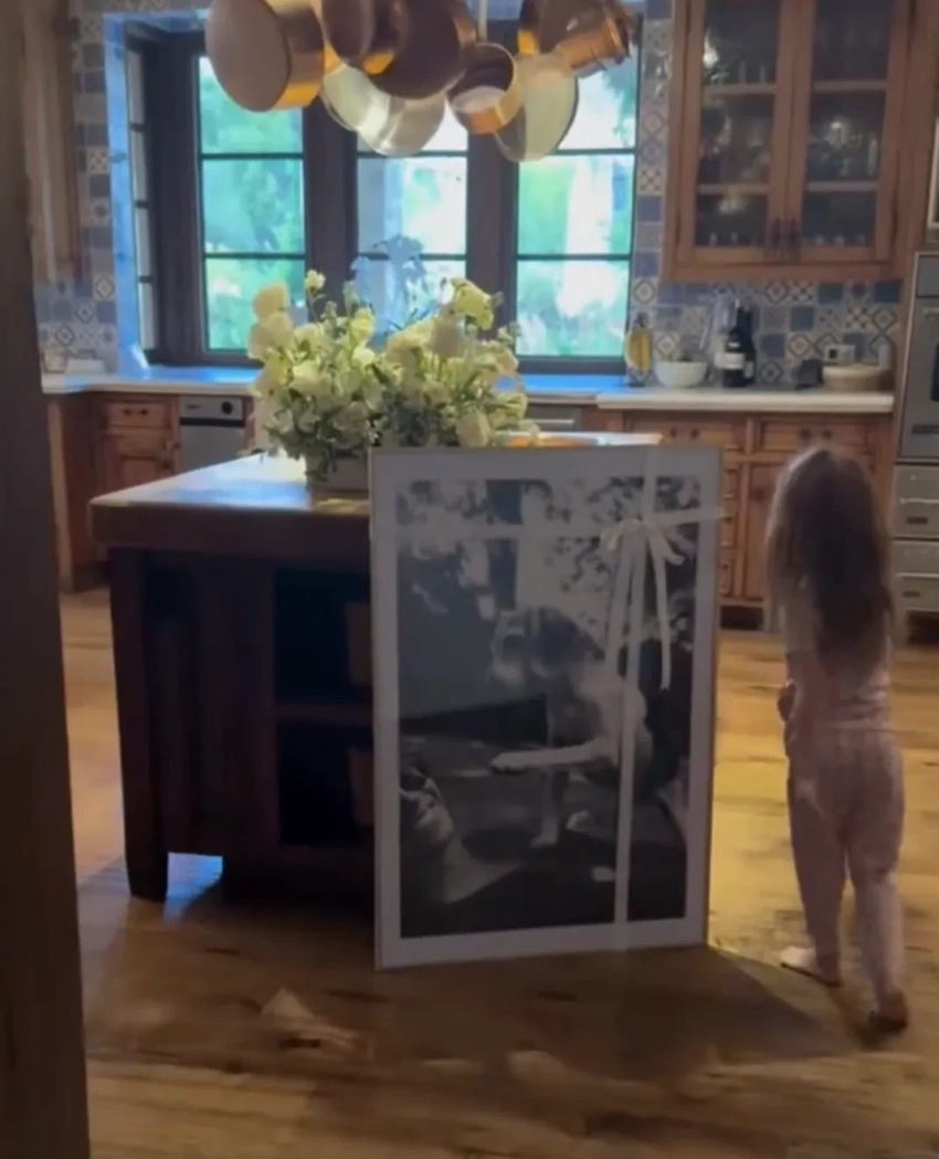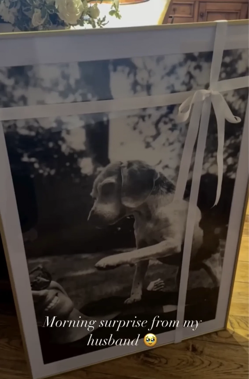 "Утренний сюрприз от моего мужа", — написала Меган в сторис* и показала большой чёрно-белый портрет, на котором она запечатлена вместе со своей собакой. Подарок от мужа приурочен к Международному дню собак, который во многих странах отмечают 26 августа.
