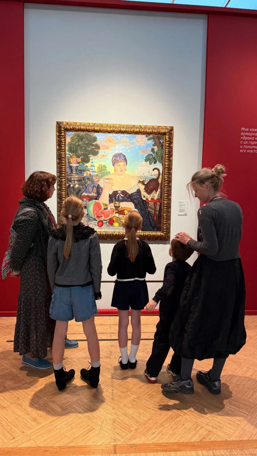 На снимке актриса с девятилетней Эрикой, восьмилетней Кирой и их пятилетним братом Львом рассматривают картину "Купчиха за чаем" Бориса Кустодиева.
