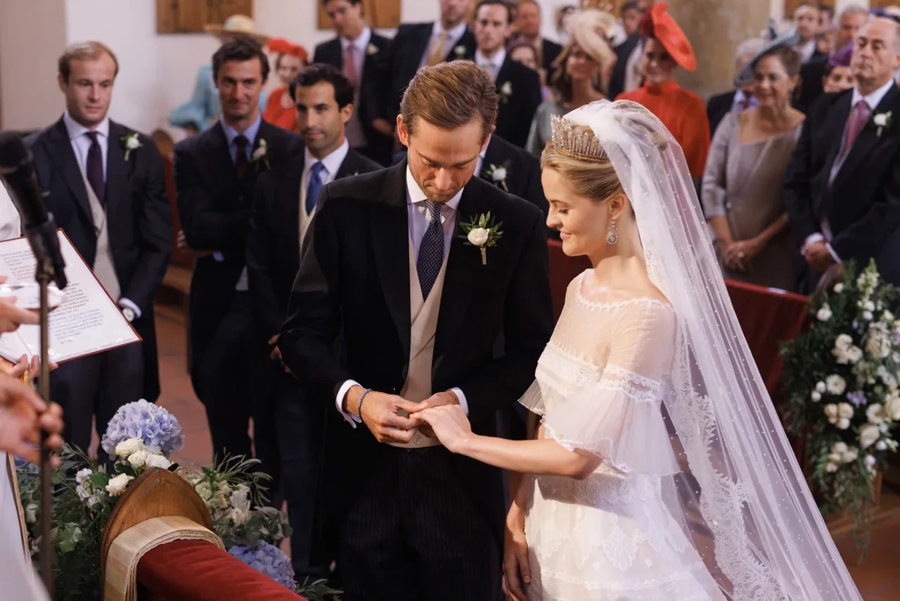 Леопольдо Мадуро Воллмер и Мария КаролинаК алтарю Мария-Каролина прошла в классическом белом платье невесты. Её образ дополняли длинная фата, бриллиантовые серьги и тиара Габсбургов, которая была создана в Вене придворным ювелиром примерно в 1890 году.