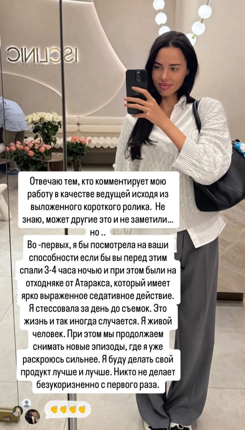 https://t.me/spletnik2006/39075Анастасия решила ответить на критику. В сторис* она объяснила, что переживала перед съёмками, мало спала, а также на её состояние повлиял приём таблеток: "Я бы посмотрела на ваши способности, если бы вы перед этим спали 3—4 часа ночью и при этом были на отходняке от атаракса, который имеет ярко выраженное седативное действие. Я стрессовала за день до съёмок. Это жизнь, и так иногда случается. Я живой человек".