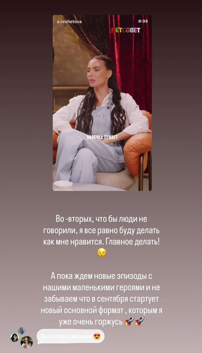 В коротких роликах можно увидеть, как Анастасия общается с приглашёнными на программу детьми. Их задача — угадать предназначение таких предметов, как счёты или грелка. Многим подписчикам Решетовой показалось, что она не справилась с ролью ведущей, в комментариях они писали: "Ведущая пресная как песок, нет харизмы никакой", "С такими способностями лучше не позорься. Быть ведущей — это не твоё, смирись ты уже", "Да, красивая, но общаться, тем более вести программу, совсем не умеет".