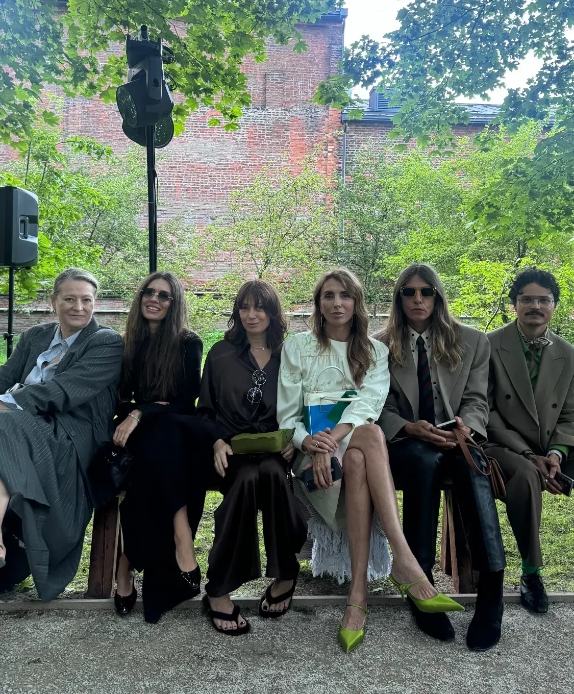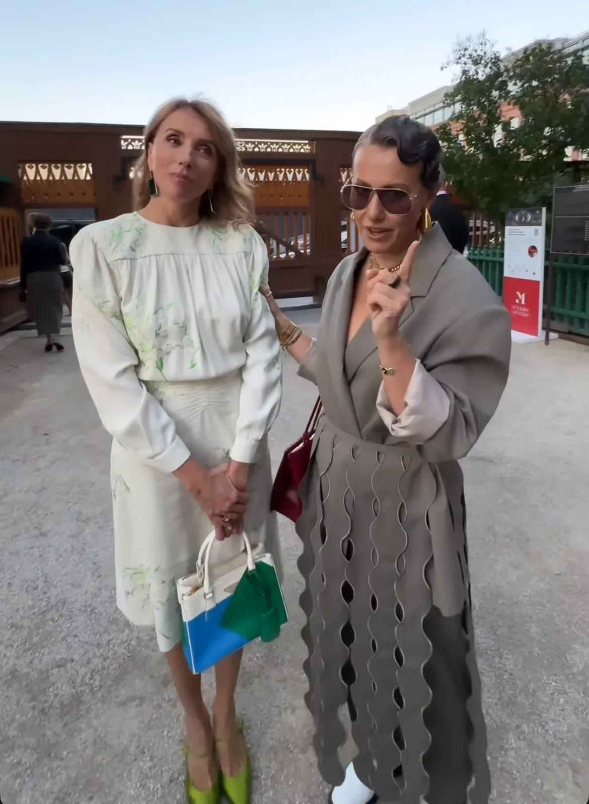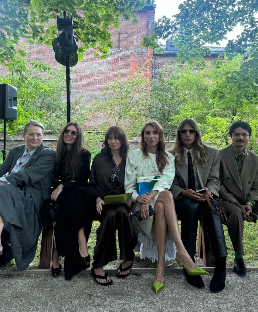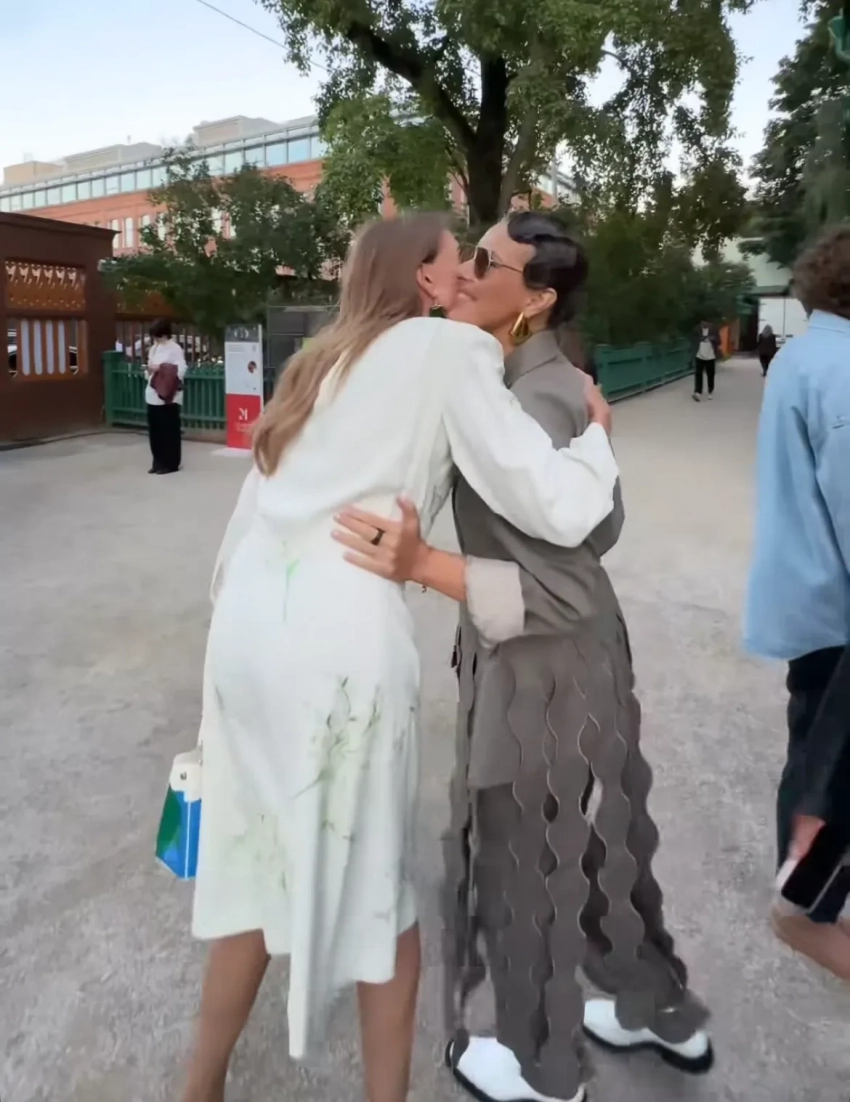 43-летняя Ксения Собчак приехала на показ сразу после линейки сына Платона. Ведущая надела костюм Ruban, который дополнила сумкой Phoebe Philo, колье Bvlgari, обувью Jil Sander и серьгами Bottega Veneta. Перед шоу Ксения встретила Светлану Бондарчук и сделала комплимент её винтажному платью Miu Miu.