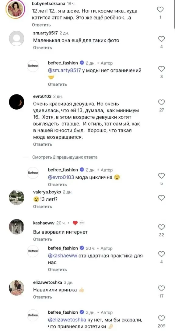 Напомним, ранее в инстаграме* российского бренда появились фото и видео с Анджелиной Смёрфит. Она попозировала перед камерой в образах из новой линейки: в том числе в микрошортах и коротком топике, открывающем её живот. В Befree объяснили выбор нового амбассадора растущей популярностью Анджелины в соцсетях и заявили, что "у моды нет возраста и ограничений". В комментариях мнения разделились. Одним понравилась реклама, но другие выразили возмущение. Многие пишут, что внешний вид девочки — слишком вызывающий для её возраста и она принимает "слишком взрослые" позы.