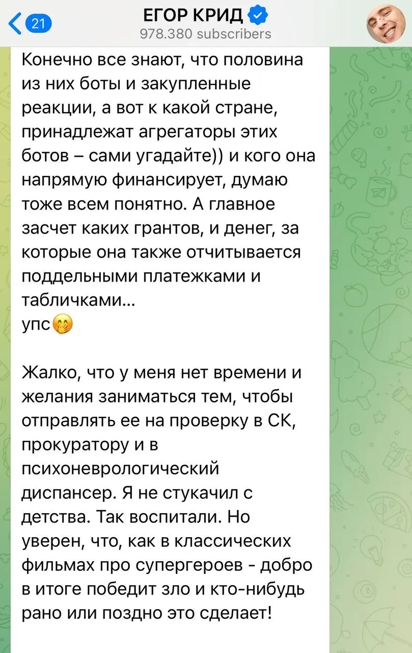 Скриншот из телеграм-канала Егора КридаПо словам певца, именно благодаря его имени Мизулина приобрела основную массу своих подписчиков в соцсетях. "Долго не думая (думать — это не про неё), оценив огромную конверсию хэштэга ЕгорКрид и усевшись за иностранный софт, она начала ТВАРЬить", — написал он (здесь и далее пунктуация и орфография автора сохранены. — Прим. ред.). При этом, заявил Крид, половина аудитории Елены в соцсетях на самом деле — боты, которых она закупает у агрегаторов из недружественных стран за счёт грантовых средств, за которые отчитывается с нарушениями. "К какой стране принадлежат агрегаторы этих ботов — сами угадайте. И кого она напрямую финансирует, думаю, тоже всем понятно. А главное — за счёт каких грантов и денег, за которые она также отчитывается поддельными платёжками и табличками…", — заявил Егор.