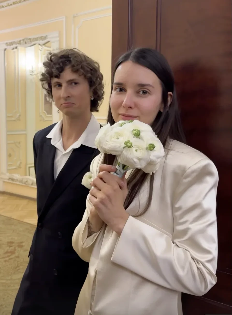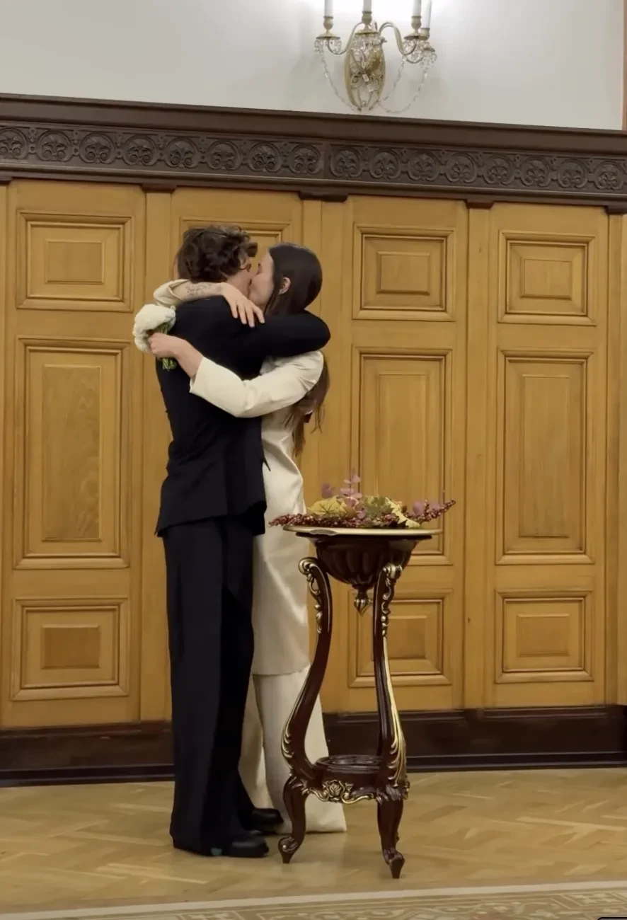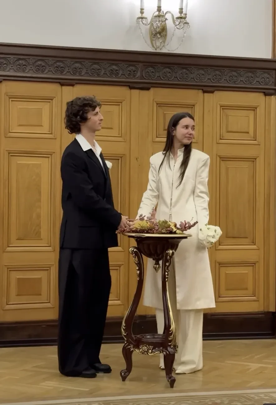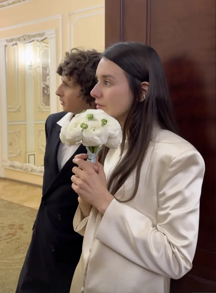 Пара поженилась в Дворце бракосочетания № 1 Москвы в присутствии друзей и близких. Невеста была одета в удлинённый жакет и брюки, а жених — в чёрный костюм. После церемонии молодожёны с гостями отметили свадьбу в ресторане.