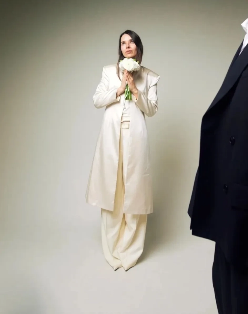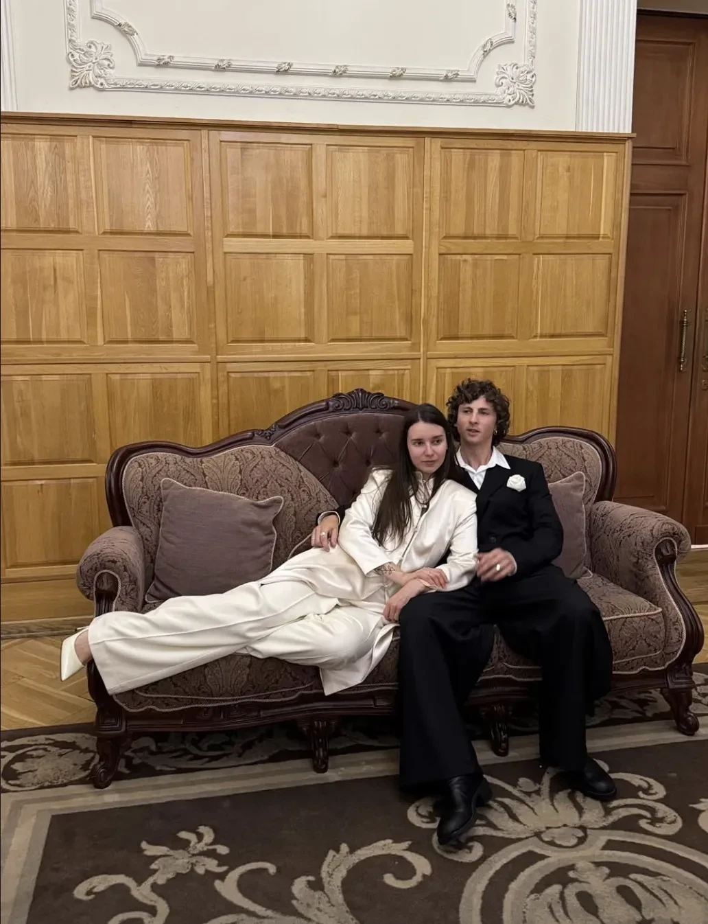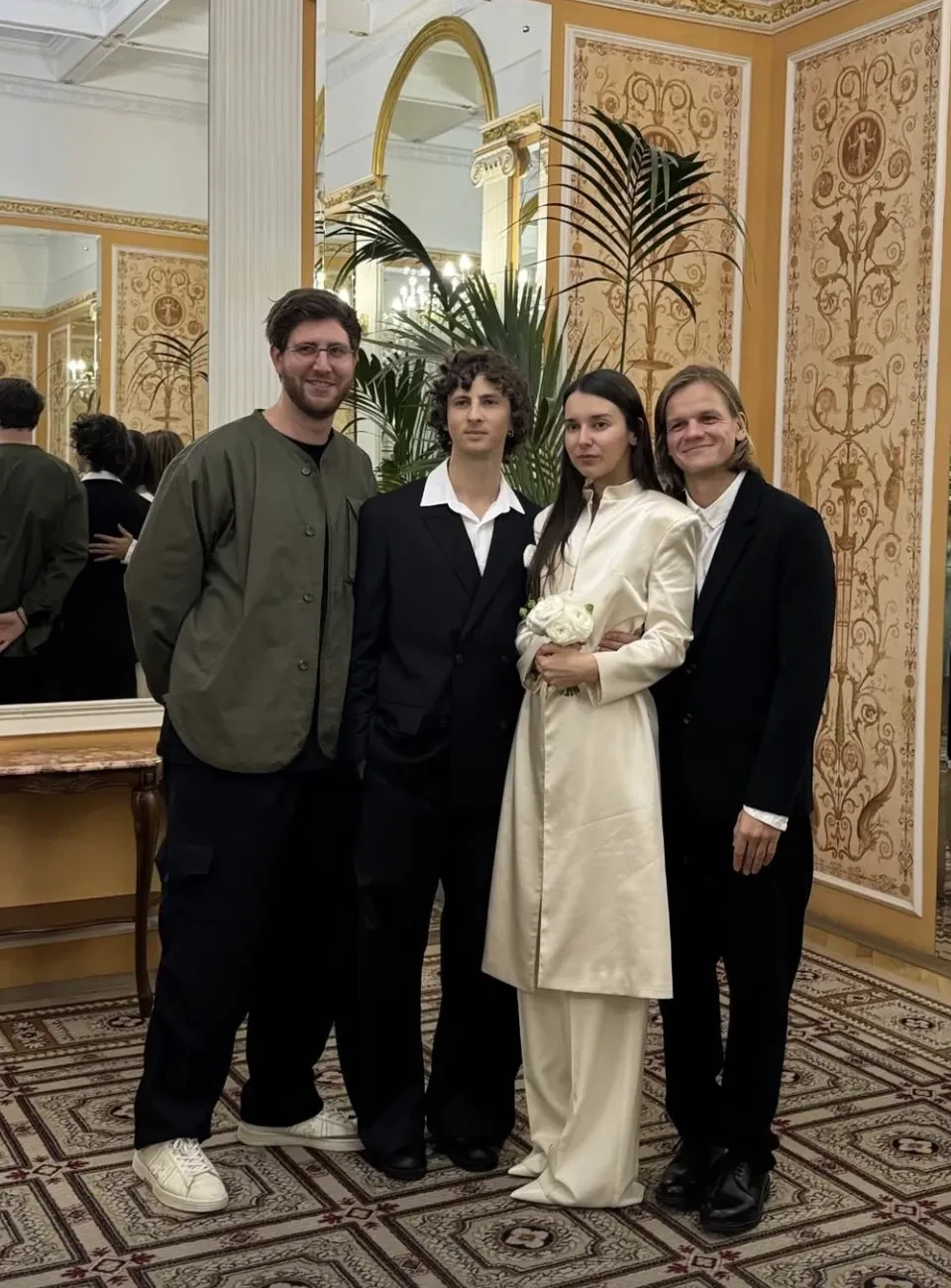 Пара поженилась в Дворце бракосочетания № 1 Москвы в присутствии друзей и близких. Невеста была одета в удлинённый жакет и брюки, а жених — в чёрный костюм. После церемонии молодожёны с гостями отметили свадьбу в ресторане.