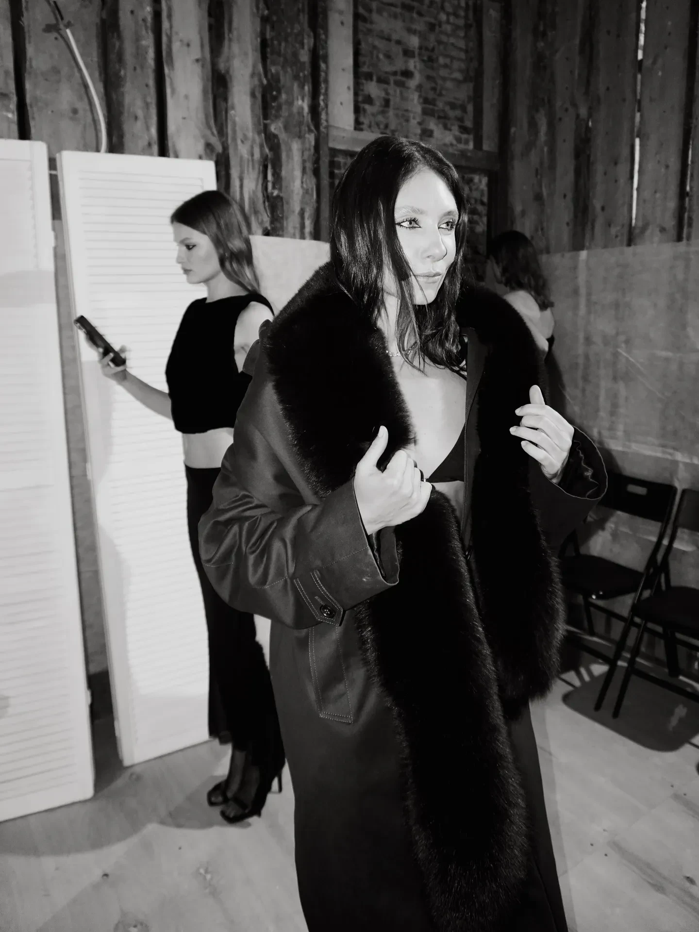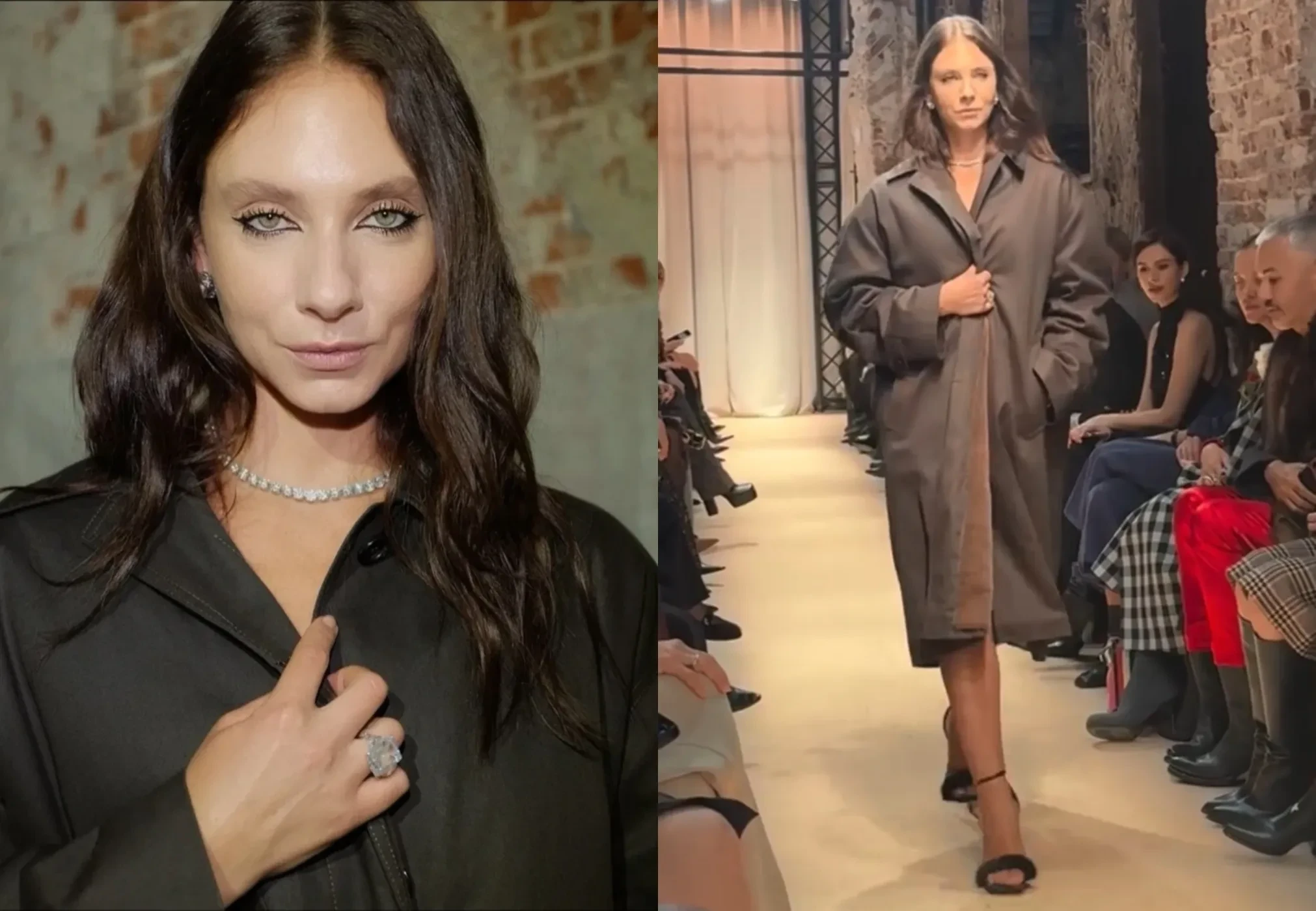 33-летняя Попова прошлась по подиуму в плаще с подкладкой из кроличьего меха. Образ модели завершали бриллиантовые украшения и туфли на шпильке. Её супруг наблюдал за показом из зала.