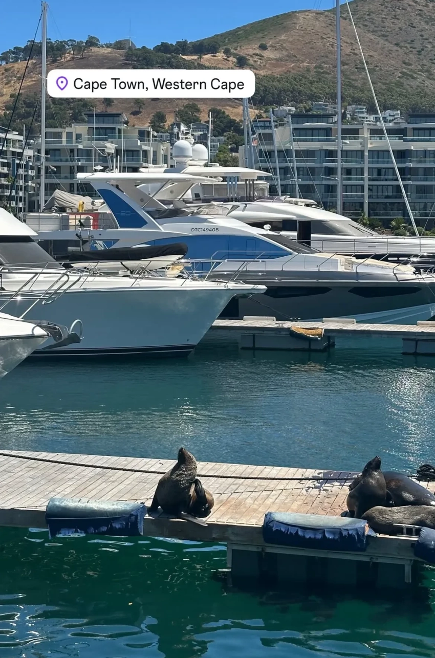 На фото Робски позирует в белой рубашке, соломенной шляпе и солнцезащитных очках на фоне пейзажа в Кейптауне. Также она показала фото морских котиков, отдыхающих на палубе.