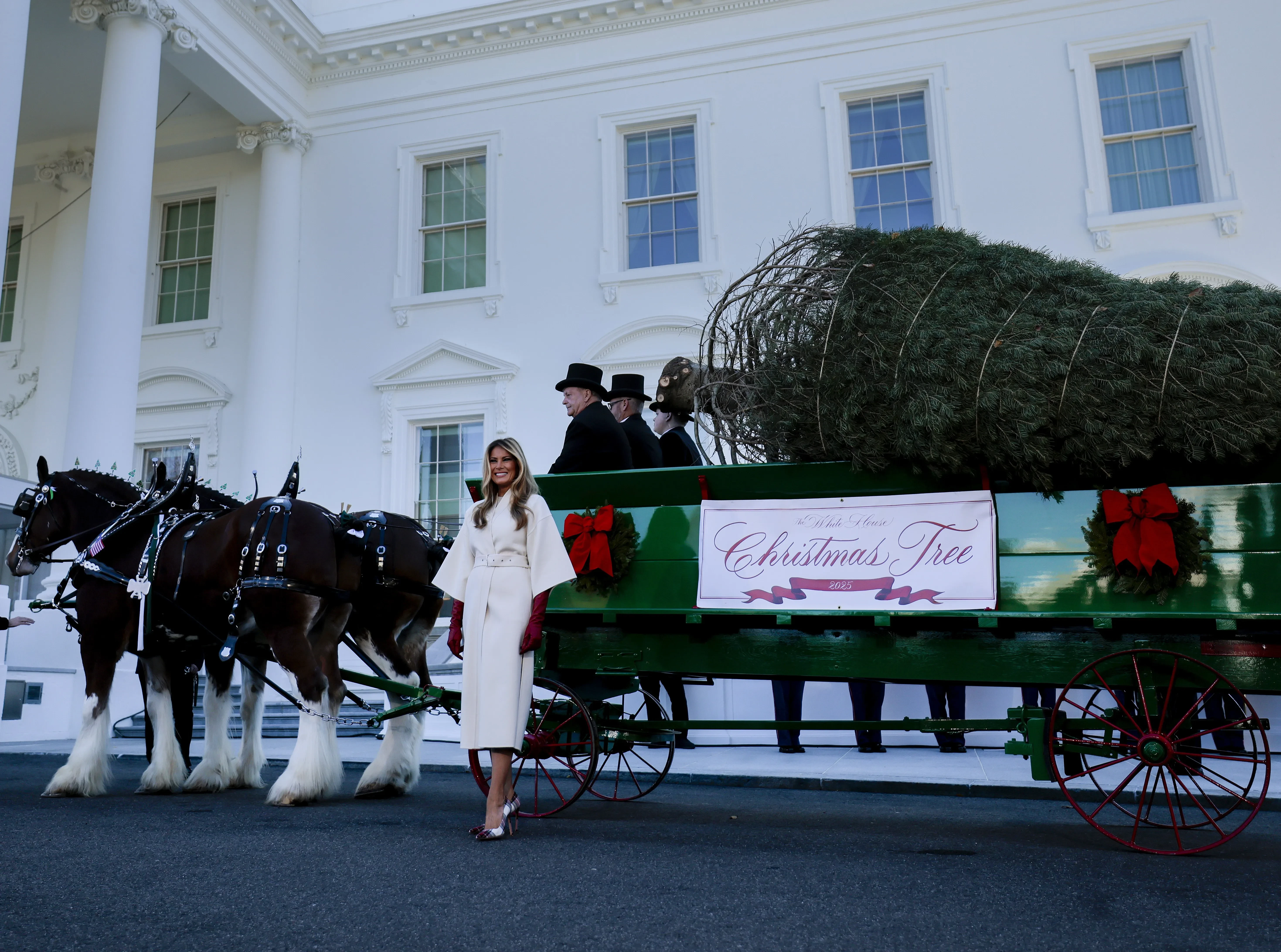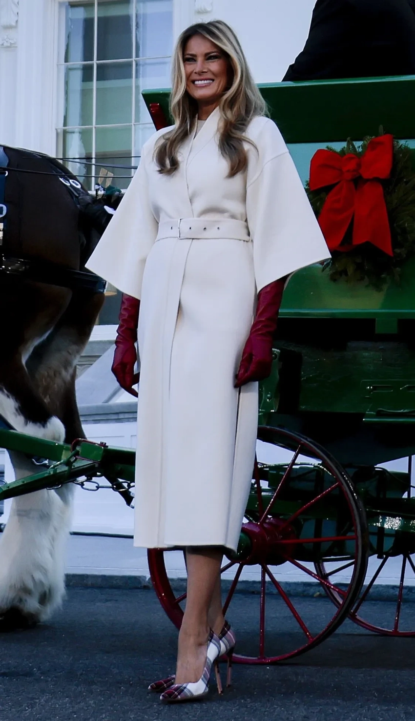 В понедельник 55-летняя первая леди США встретила официальную рождественскую ёлку Белого дома, которую представят публике нарядной в начале декабря. Мелания появилась перед прессой в белом костюме Dior и бордовых кожаных перчатках, дополнив образ туфлями в клетку.