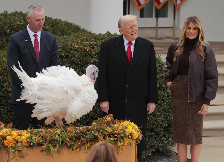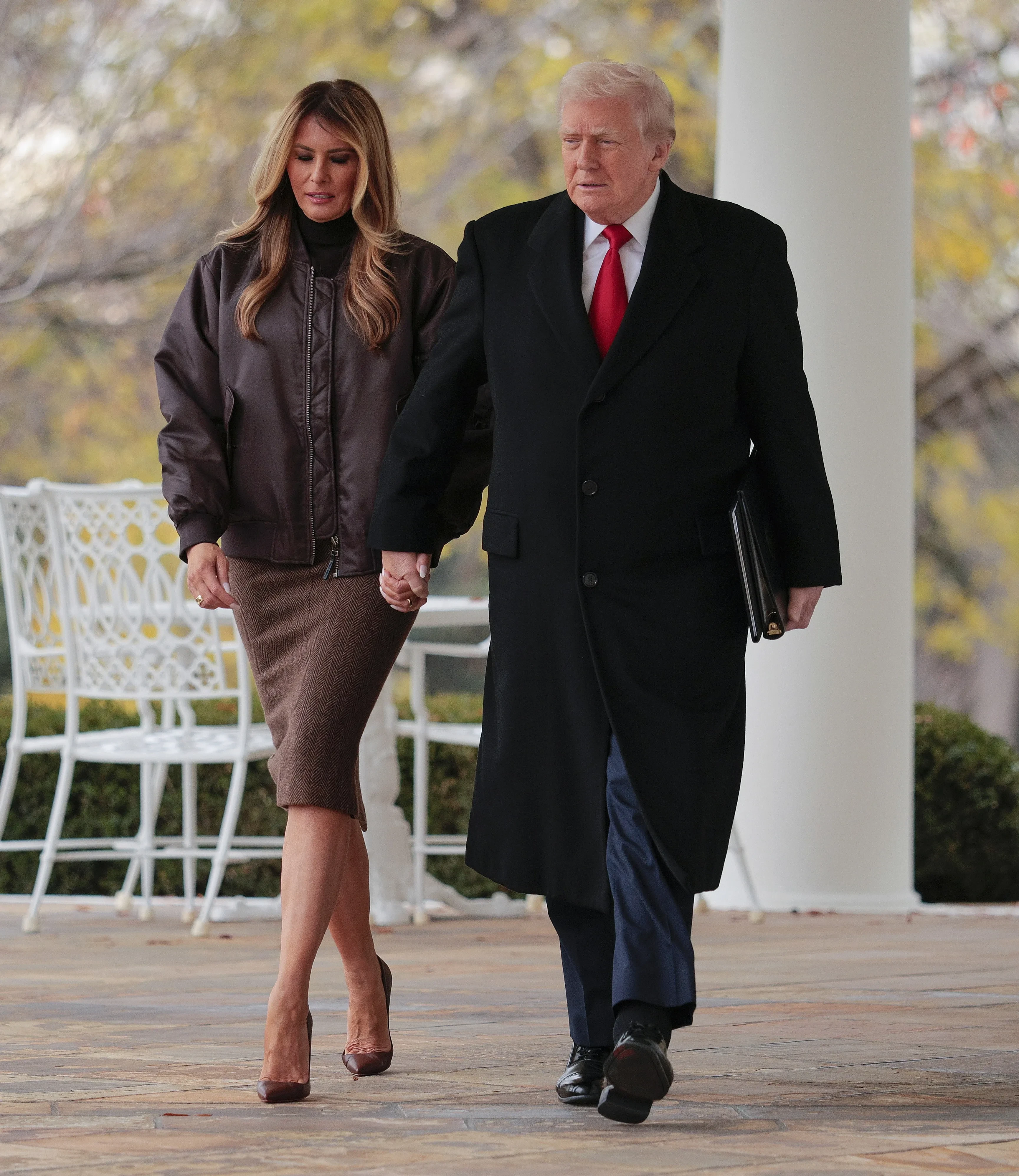 Мелания ТрампМелания ТрампМелания ТрампНа следующий день первая леди вместе с 79-летним мужем, президентом США Дональдом Трампом, приняли участие в мероприятии в Розовом саду Белого дома, приуроченном ко Дню благодарения. Дональд в рамках ежегодной традиции помиловал индейку, которая является символом праздника. Мелания позировала рядом с супругом в образе total brown: водолазке, юбке-карандаше, бомбере и туфлях.