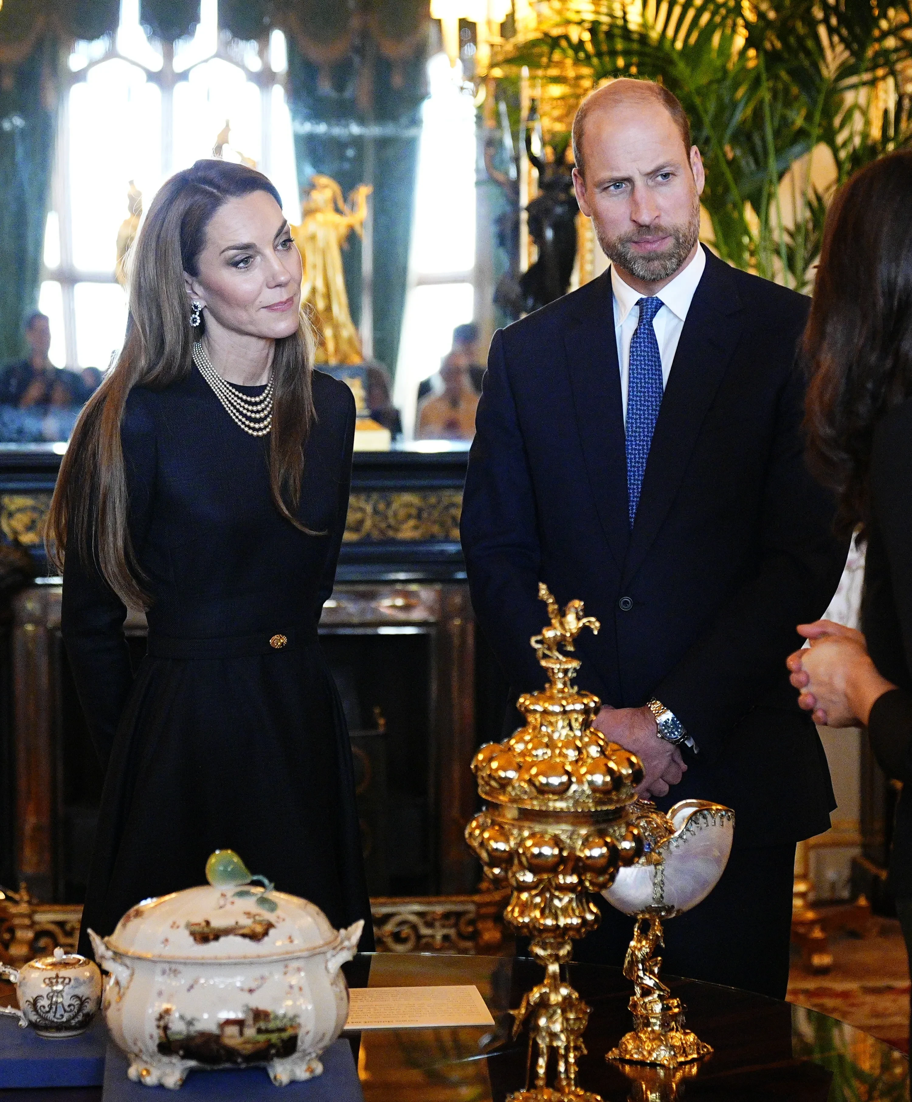 43-летняя принцесса Уэльская вместе с мужем рассматривали экспонаты из королевских коллекций, связанные с Германией. Для выхода в свет Кейт Миддлтон выбрала чёрное платье, дополнив образ жемчужным ожерельем и серьгами принцессы Дианы.