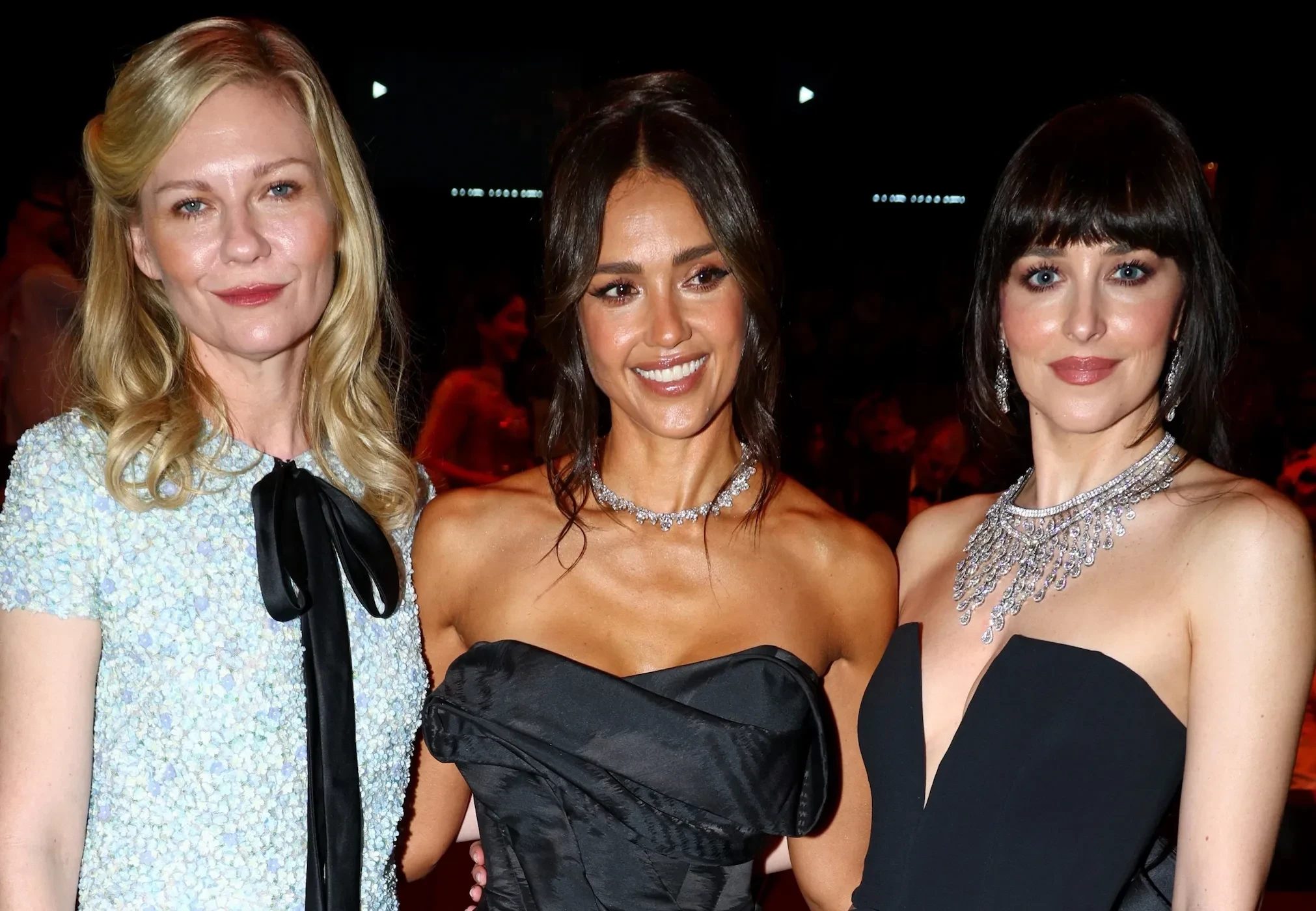 44-летняя Джессика Альба вышла на красную дорожку в чёрном платье Elie Saab, а Кирстен Данст позировала в наряде из дебютной коллекции Джонатана Андерсона для Dior. 36-летняя Дакота Джонсон надела платье Alessandra Rich с декольте, а Ана де Армас, которая недавно рассталась с Томом Крузом, блистала в Louis Vuitton.