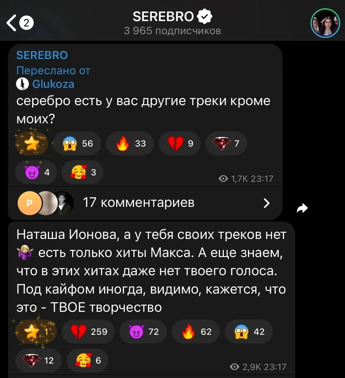 Телеграм-канал "Серебра"Ответ группы не заставил себя ждать. Участницы напомнили, что права на песню принадлежат не Глюкозе, а также резко высказались о самой Ионовой, упомянув её недавний скандал: "Наташа Ионова, а у тебя своих треков нет. Есть только хиты Макса. А ещё знаем, что в этих хитах даже нет твоего голоса. Под кайфом иногда, видимо, кажется, что это — твоё творчество".