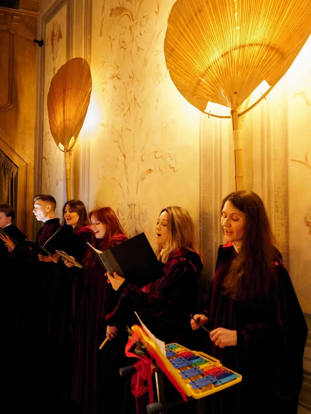 Светские подруги 41-летней Гольденберг, как и она сама, нарядились в вечерние образы, а за ужином их ждали традиционные новогодние угощения: кастрюля салата оливье, бутерброды с икрой, мандарины и игристое вино. Развлекал гостей хор, поющий рождественские колядки.