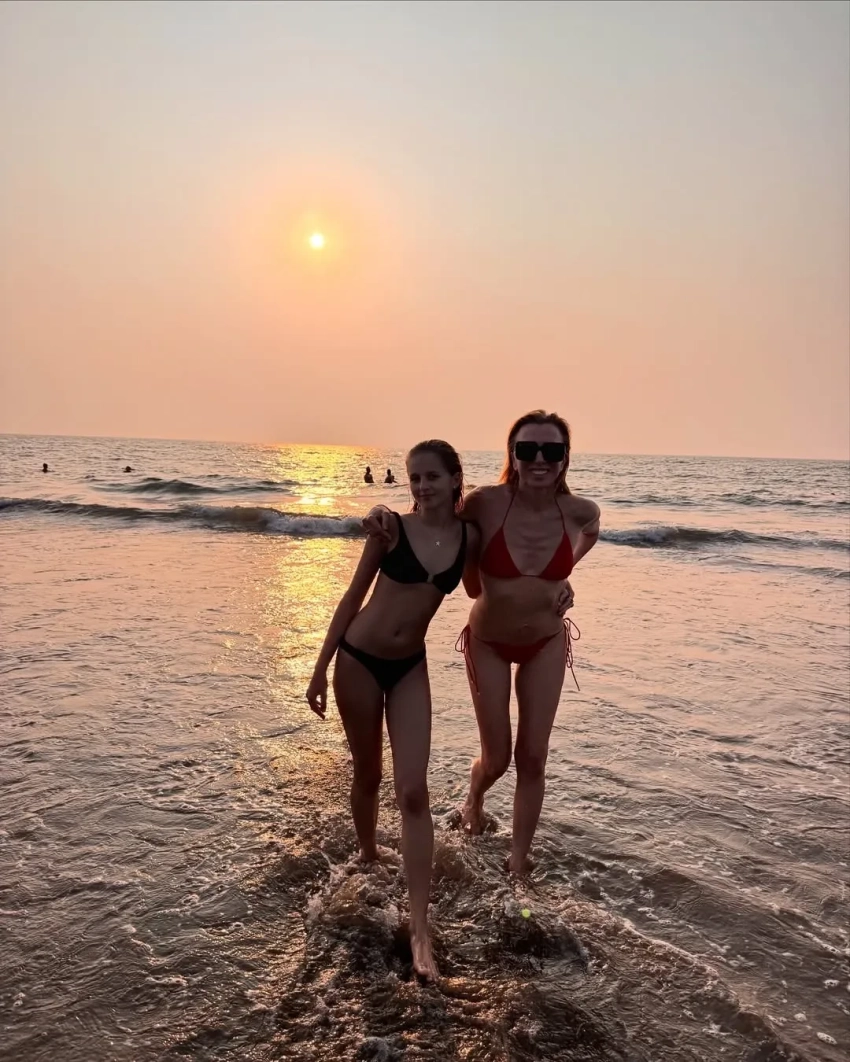 На снимках Бондарчук позирует на пляже в красном бикини Lavarice одна и в компании 13-летней падчерицы Юнны — дочери её мужа Сергея Харченко.