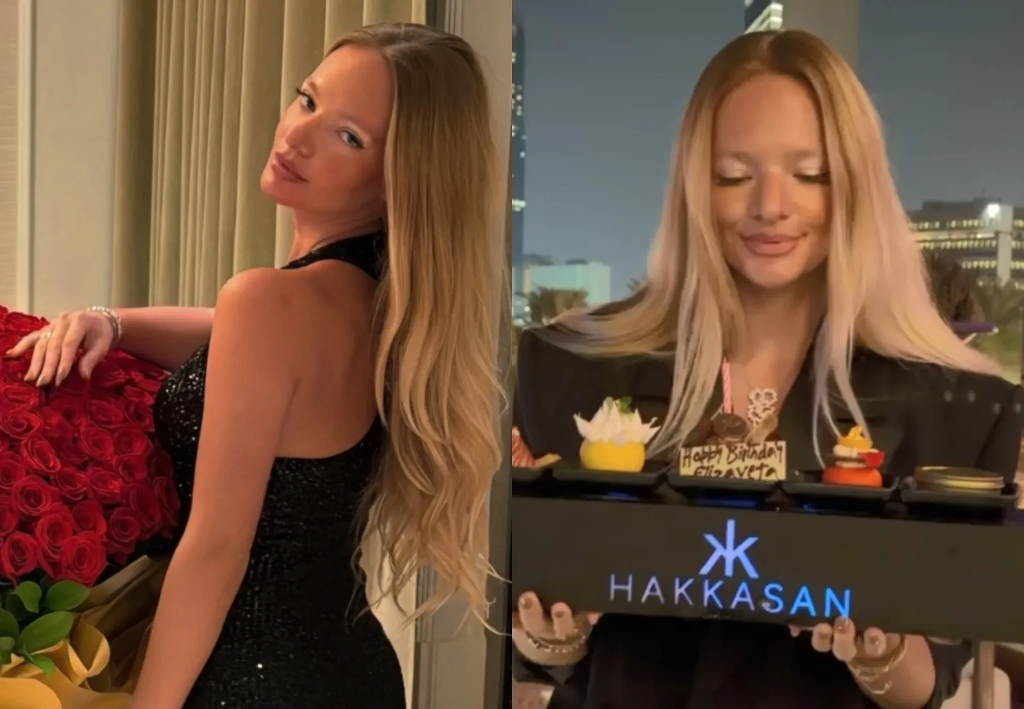 Вечернее платье с декольте, букет красных роз и украшения Bvlgari в подарок: Елизавета Пескова отметила 28-летие в Абу-Даби