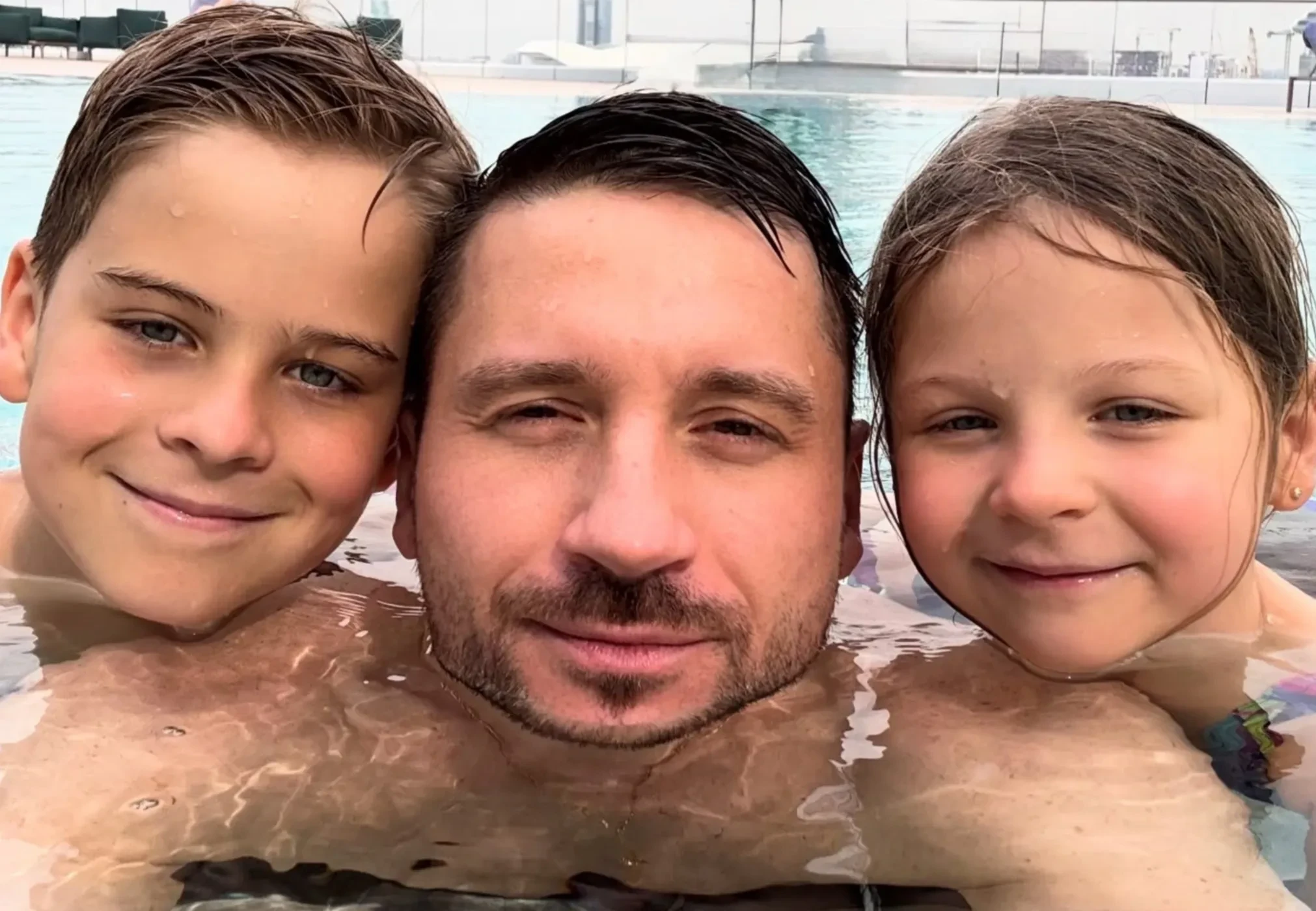 Лазарев опубликовал снимок, на котором позирует с наследниками, стоя по шею в бассейне, и шуточно подписал его: "Мои. Мы как Змей Горыныч с тремя головами".