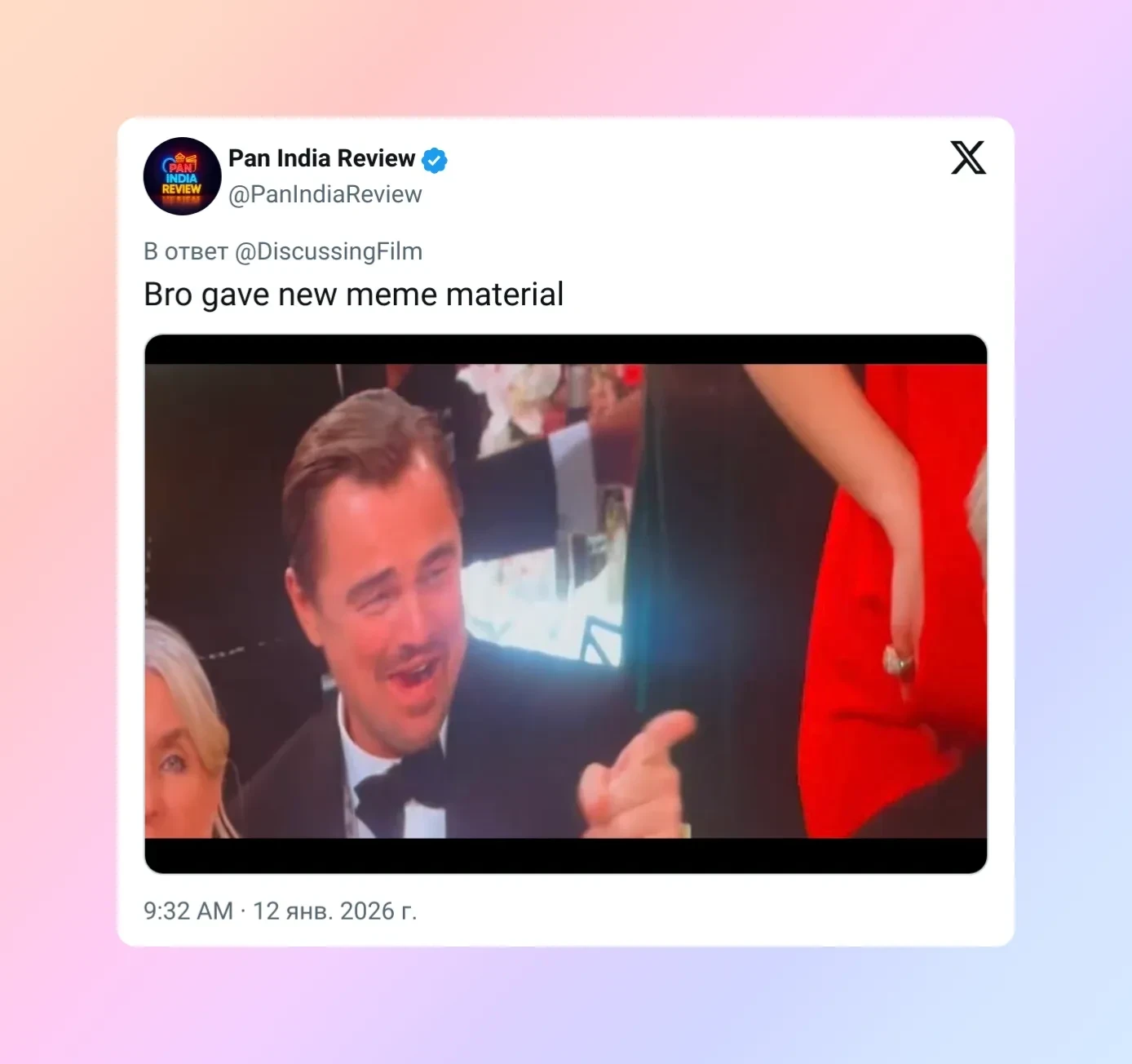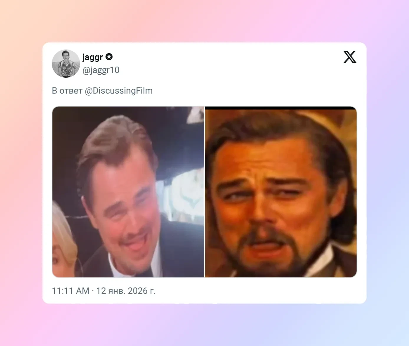 Леонардо ДиКаприо стал героем вирусного видео с церемонии вручения премии "Золотой глобус — 2026", которая состоялась на днях в Лос-Анджелесе. В сети 51-летнего актёра теперь называют новым "королём мемов" — вместо Бена Аффлека, который носил этот негласный титул прежде.