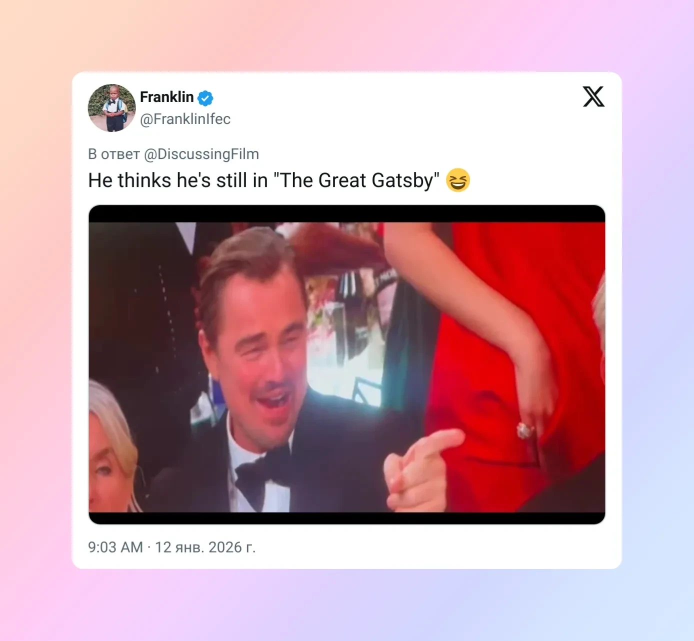 Текст поста: "Как итальянец я за такое короткое время столько жестов выдать не смог бы. Вот это талант"Текст поста: "Либо он с кем-то разговаривает, либо мы все живём на острове проклятых"Текст поста: "Выглядит так, будто он изобрёл Голливуд во время перерыва на перекус".Текст поста: "Он думает, что всё ещё в "Великом Гэтсби"Текст поста: "Бро подарил нам новый материал для мемов"Видео с реакцией ДиКаприо стало не единственным любопытным моментом с его участием на церемонии. Так, ведущая вечера со сцены пошутила про его любовь к молодым моделям. Кроме того, в сети обсуждали разговор ДиКаприо с коллегой по цеху Джулией Робертс.