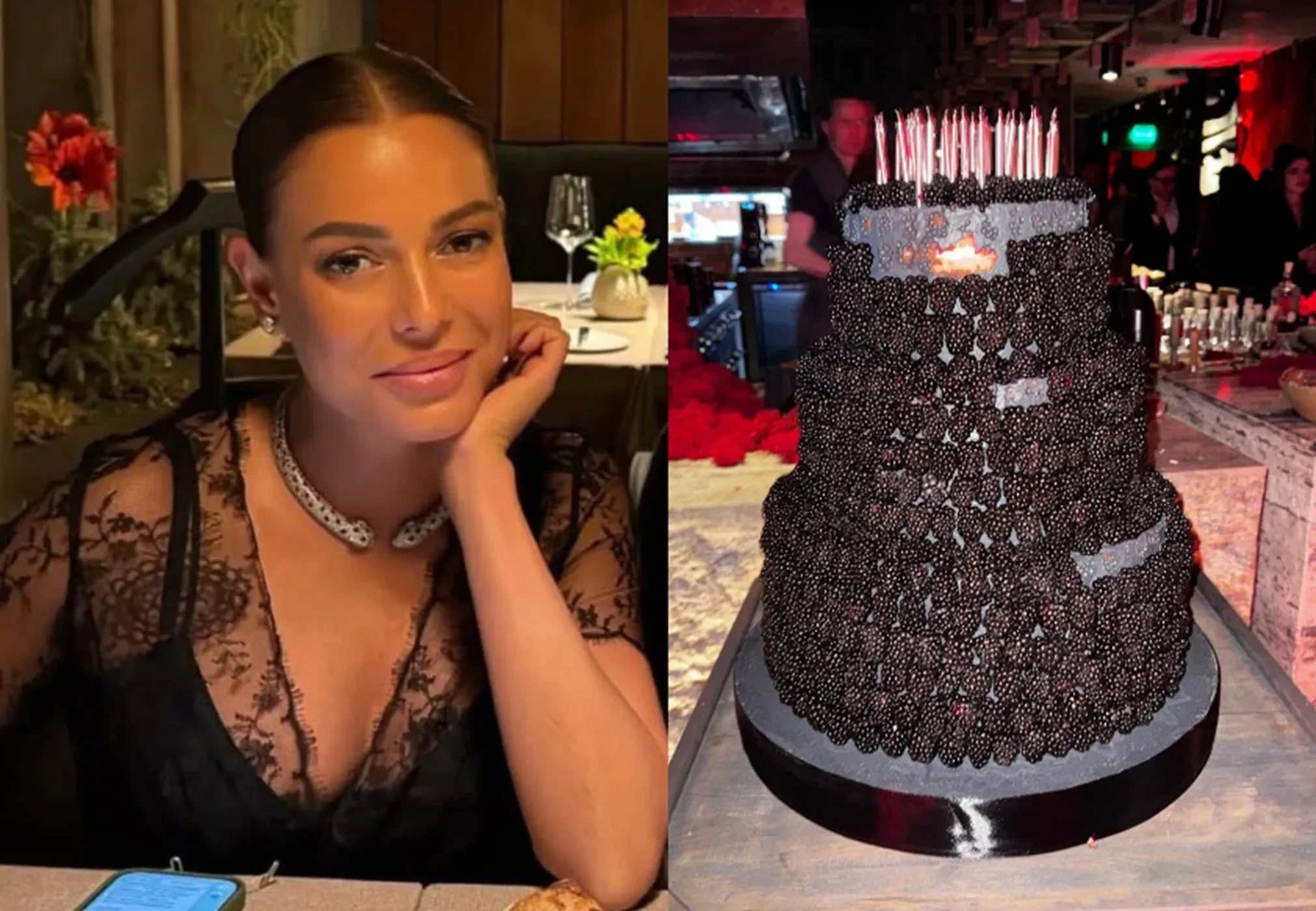 Именинница появилась на празднике в чёрном платье с кружевом. Свой образ Потупчик дополнила колье Cartier с бриллиантами стоимостью до 15 млн рублей.