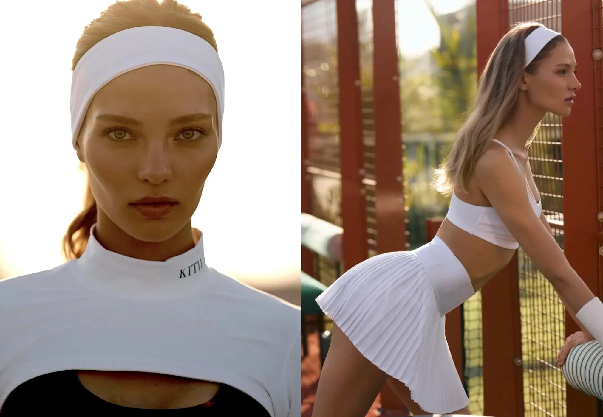 Кафельникова примерила плиссированную юбку, зелёную олимпийку, микрошорты с топом, короткий белый лонгслив и белое спортивное платье. Образы дополнили повязка на голову, козырёк и часы.