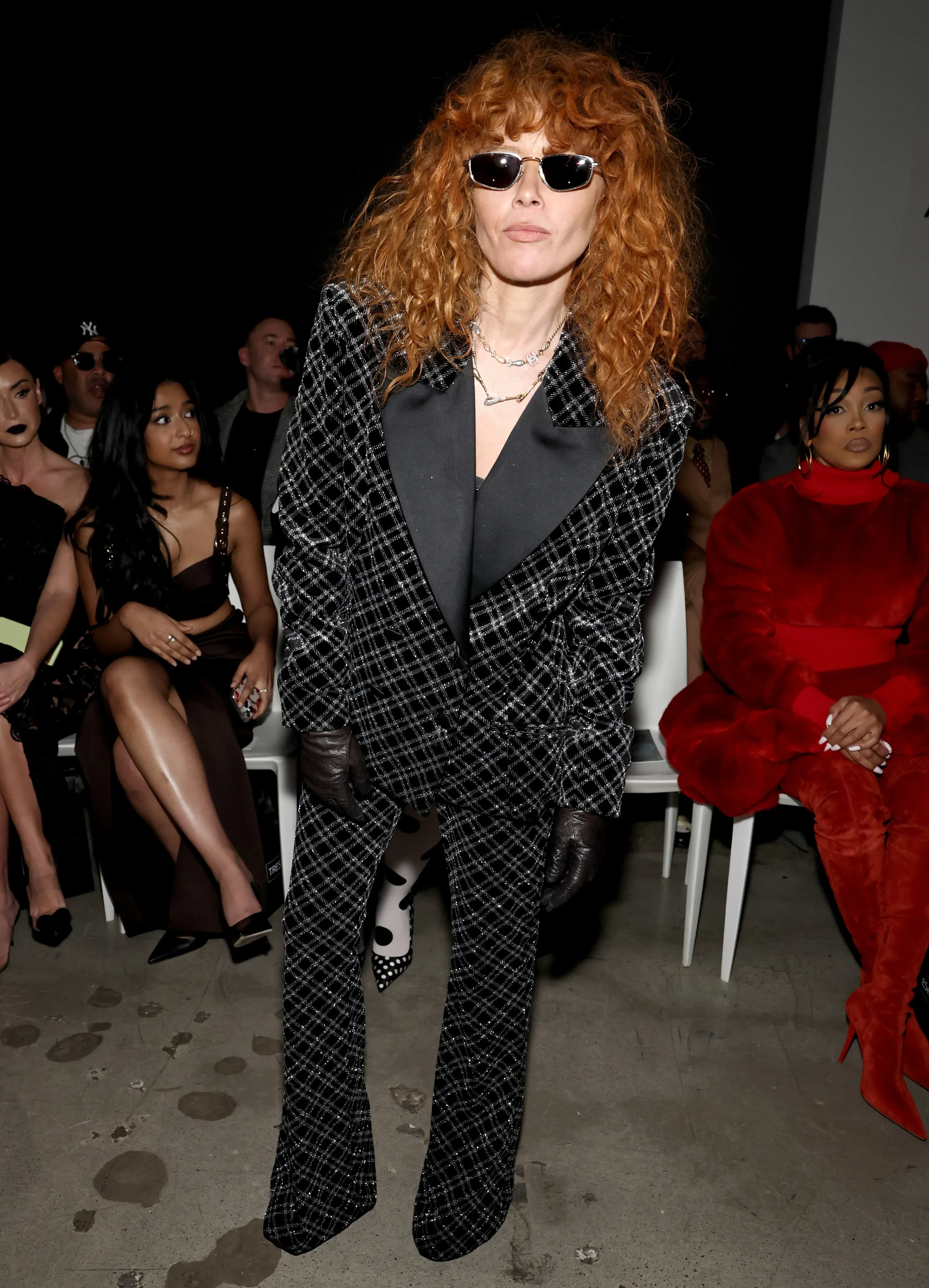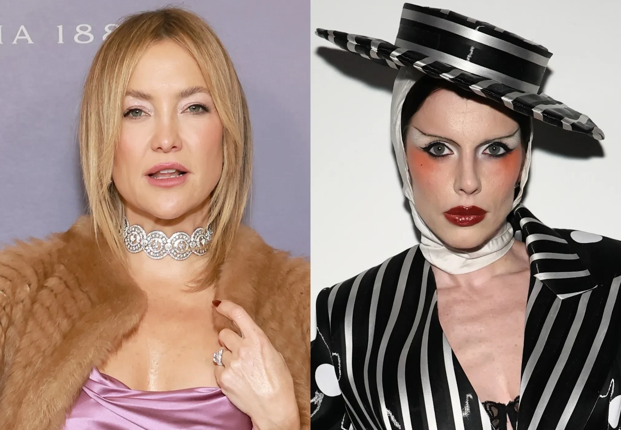 46-летняя Кейт Хадсон позировала в лиловом платье и шубе, а 35-летняя Тейяна Тейлор надела красное кутюрное платье Tamara Ralph. Любительница необычных образов Джулия Фокс пришла на показ в чёрно-белом костюме в полоску и горошек.