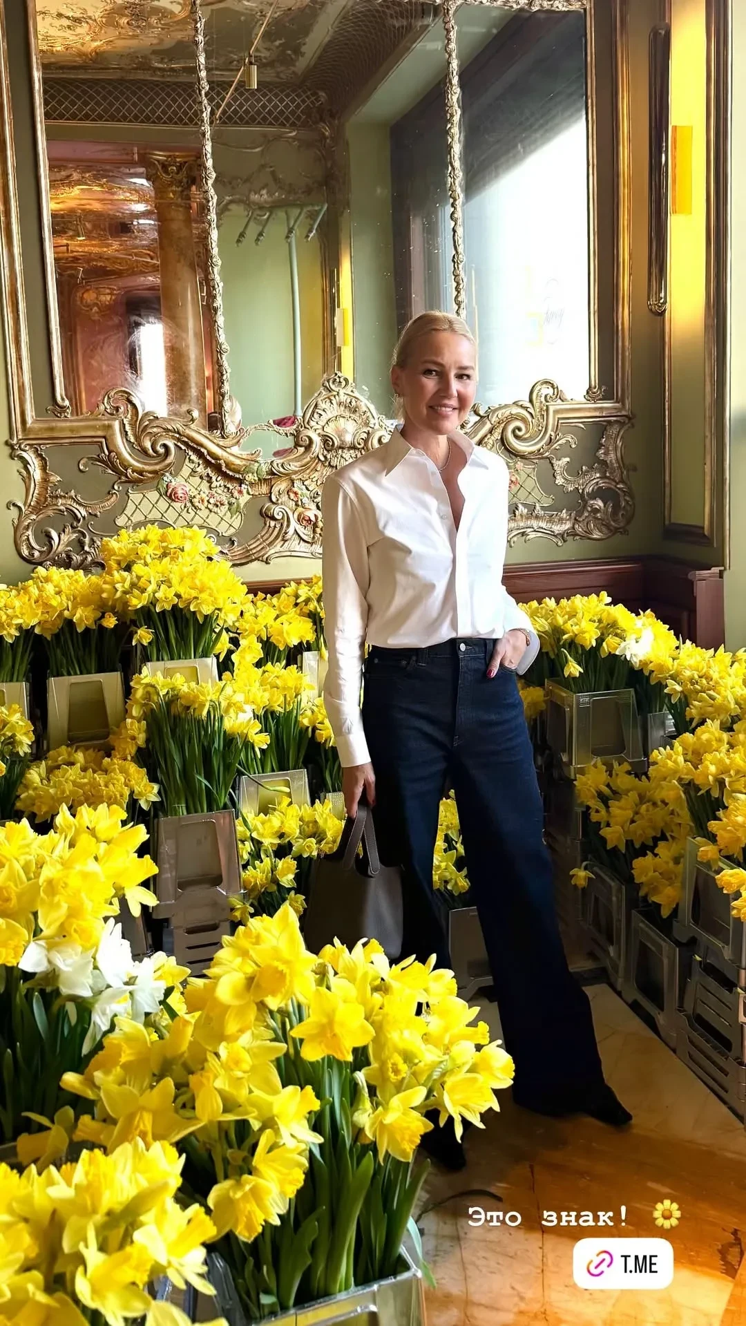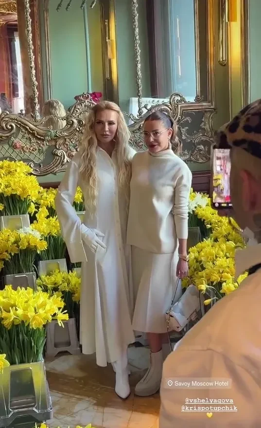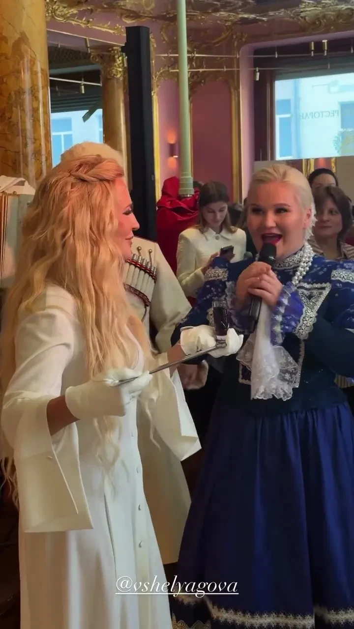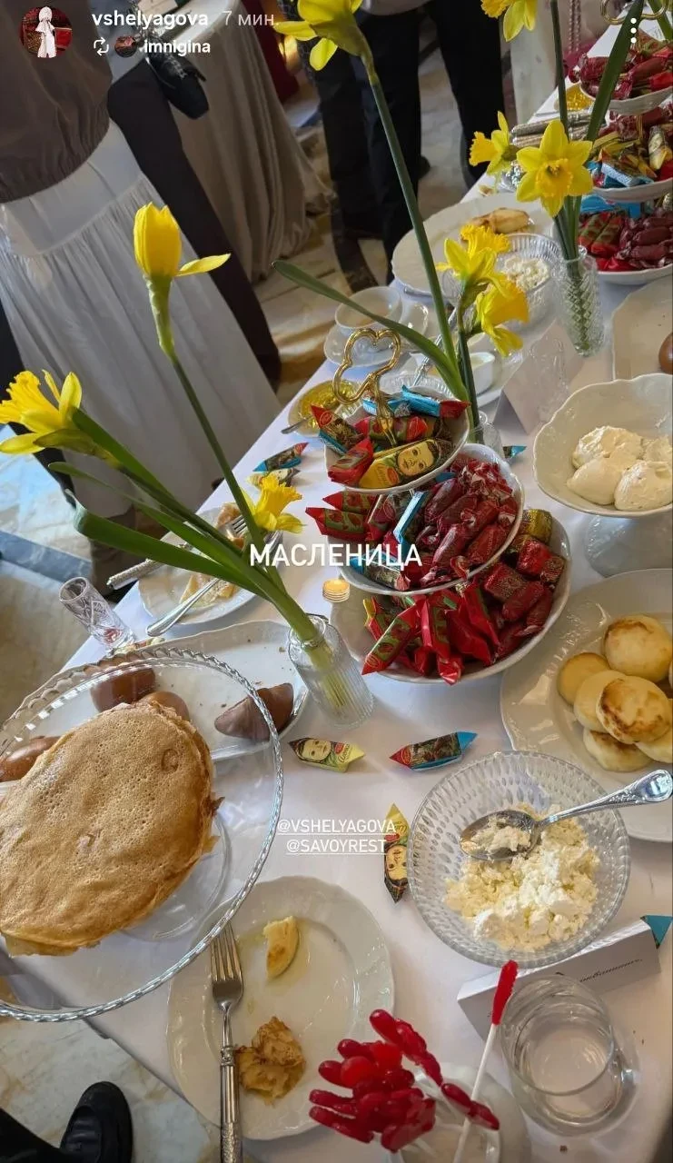 Хозяйка праздника, которая лишь недавно сделала пластическую операцию, появилась перед гостями с внучкой. Присутствующих, для которых был объявлен "жёлто-белый" дресс-код, угощали блинами, их развлекал казачий хор. Пространство было украшено живыми нарциссами.