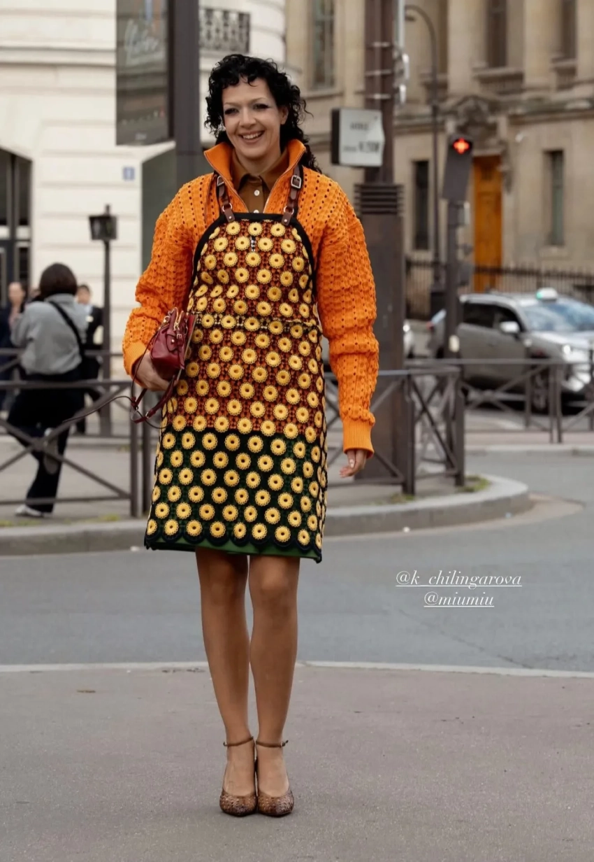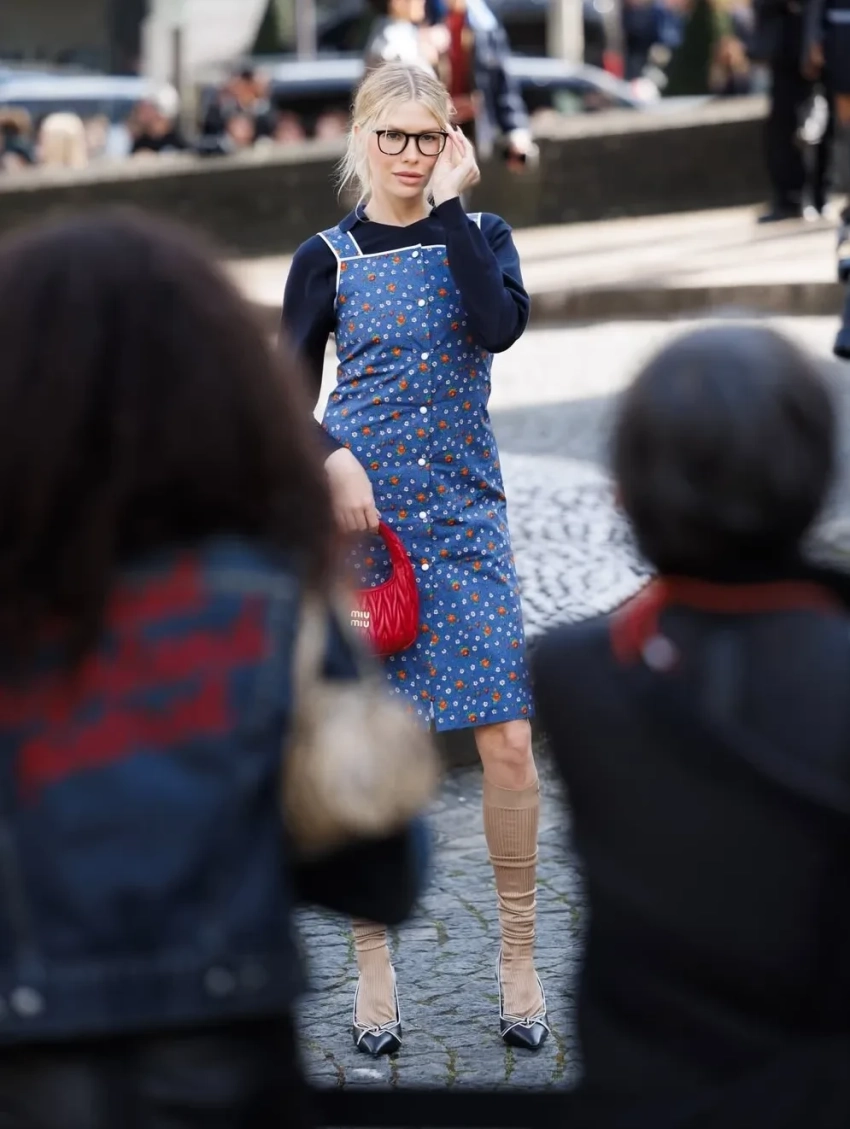Неделя моды в Париже: Елена Перминова в "советском" платье, Оксана Самойлова (в чулках) среди гостей и Джиллиан Андерсон — на подиуме на показе Miu Miu
