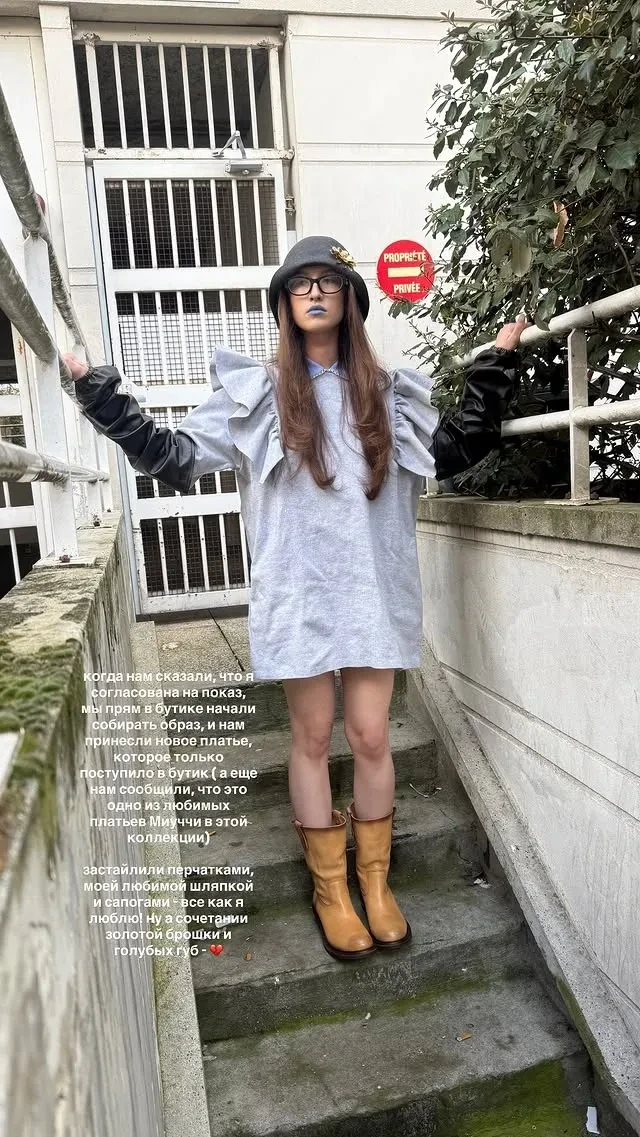 Неприятности не испортили впечатления девушки о показе. На шоу Барашик пришла в монобрендовом образе из серого платья с кожаными сапогами и перчатками. За стиль Лизы на показе отвечала Ангелина Лешина.