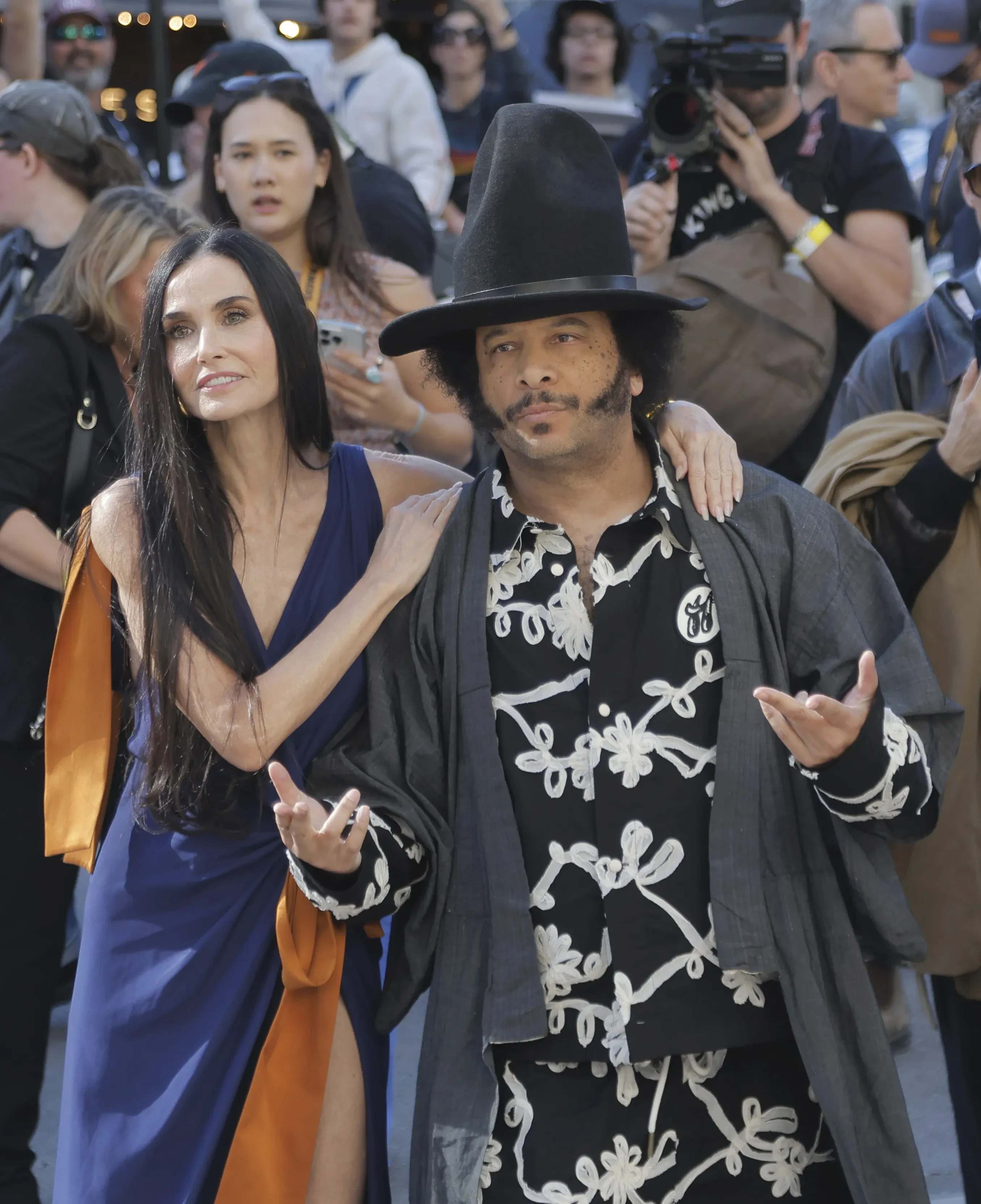 63-летняя Деми Мур появилась перед камерами в шелковом платье Saint Laurent с глубокими разрезами. 67-летняя Мишель Пфайффер отдала предпочтение классическому тёмно-синему брючному костюму с фактурным жакетом и широкими брюками, дополнив его шелковой голубой блузкой.