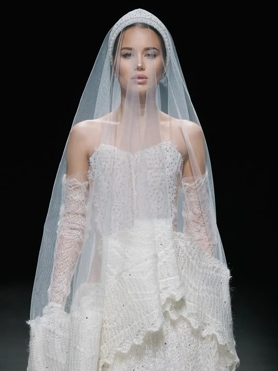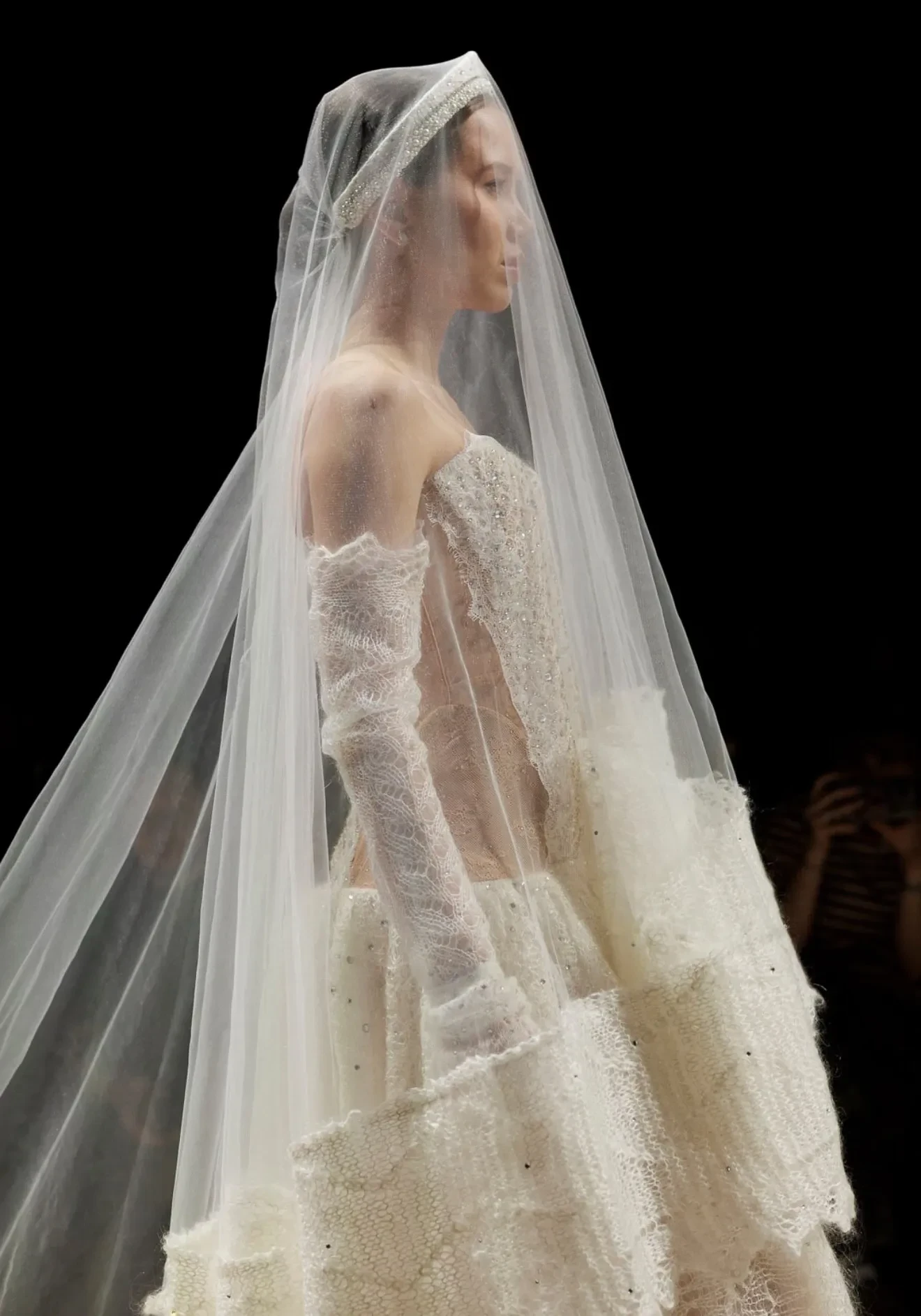 20-летняя Аврора Киба вышла на подиум в свадебном образе с фатой в финале шоу, а 27-летняя Марьям Тилляева открыла показ в белом свитере и юбке в тон.
