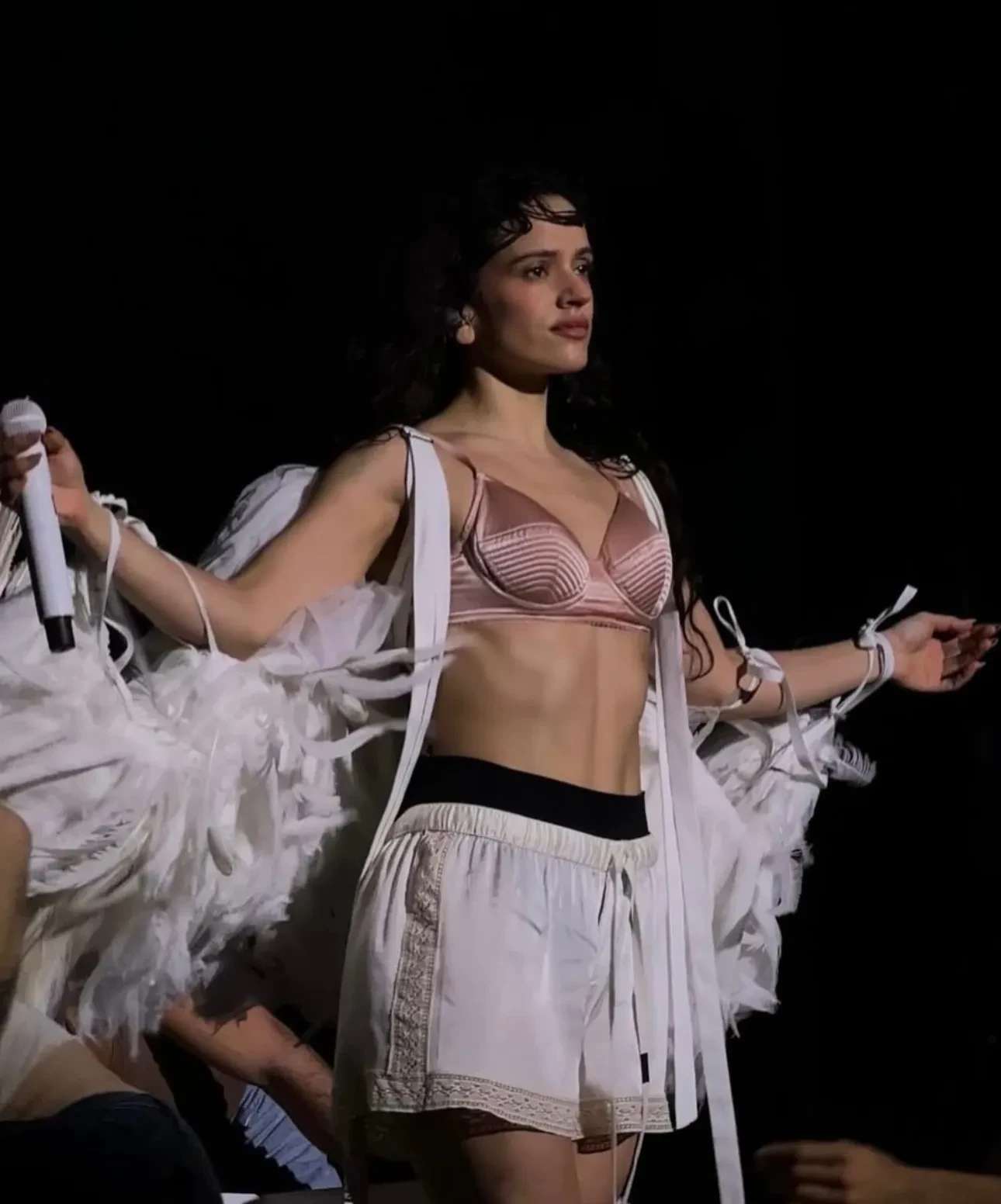 РозалияРозалияРозалия исполнила несколько песен в розовом атласном бра. Известно, что тур певицы продлится до сентября и завершится в Пуэрто-Рико, поэтому есть вероятность, что данный наряд мы увидим ещё не раз на певице.