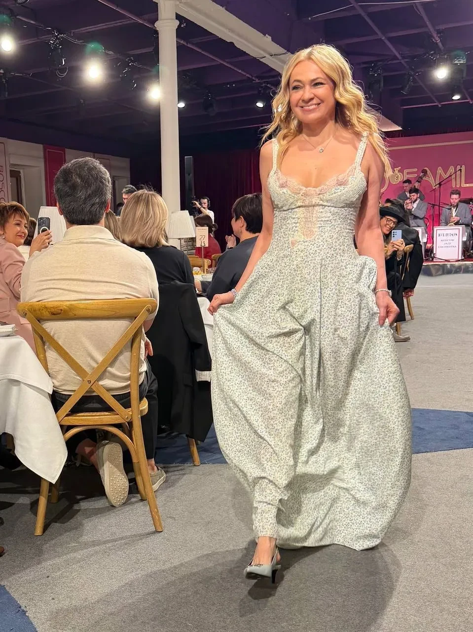 Модное шоу "Стильные ребята" открывали Евгений Плющенко и Яна Рудковская с детьми. Продюсер прошлась по импровизированному подиуму в белом романтичном платье с кружевными вставками, а её супруг (сделавший недавно подтяжку лица) и сыновья — пятилетний Арсений и 13-летний Александр — представили похожие образы в светлых тонах.