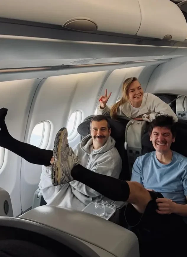 Бывший ведущий Первого канала Иван Ургант выложил в соцсети фото, где команда "Вечернего Урганта" позирует в бизнес-классе самолёта. Снимок с Аллой Михеевой и Александром Гудковым Иван подписал так: "Летят варикозные птицы!!!".
