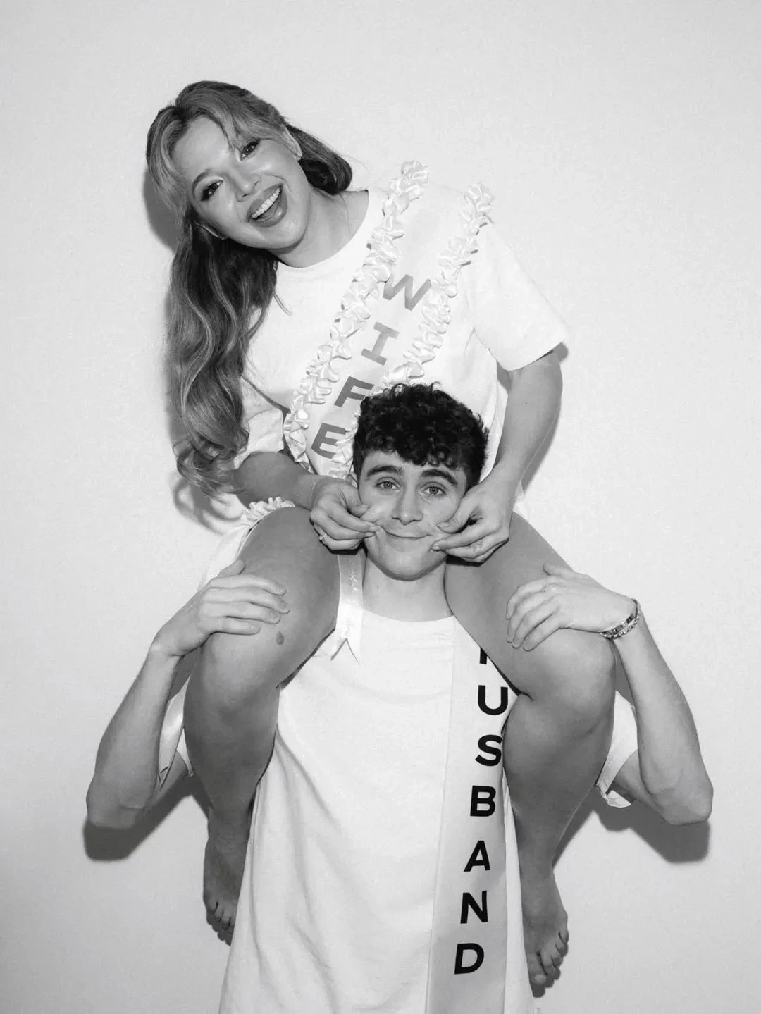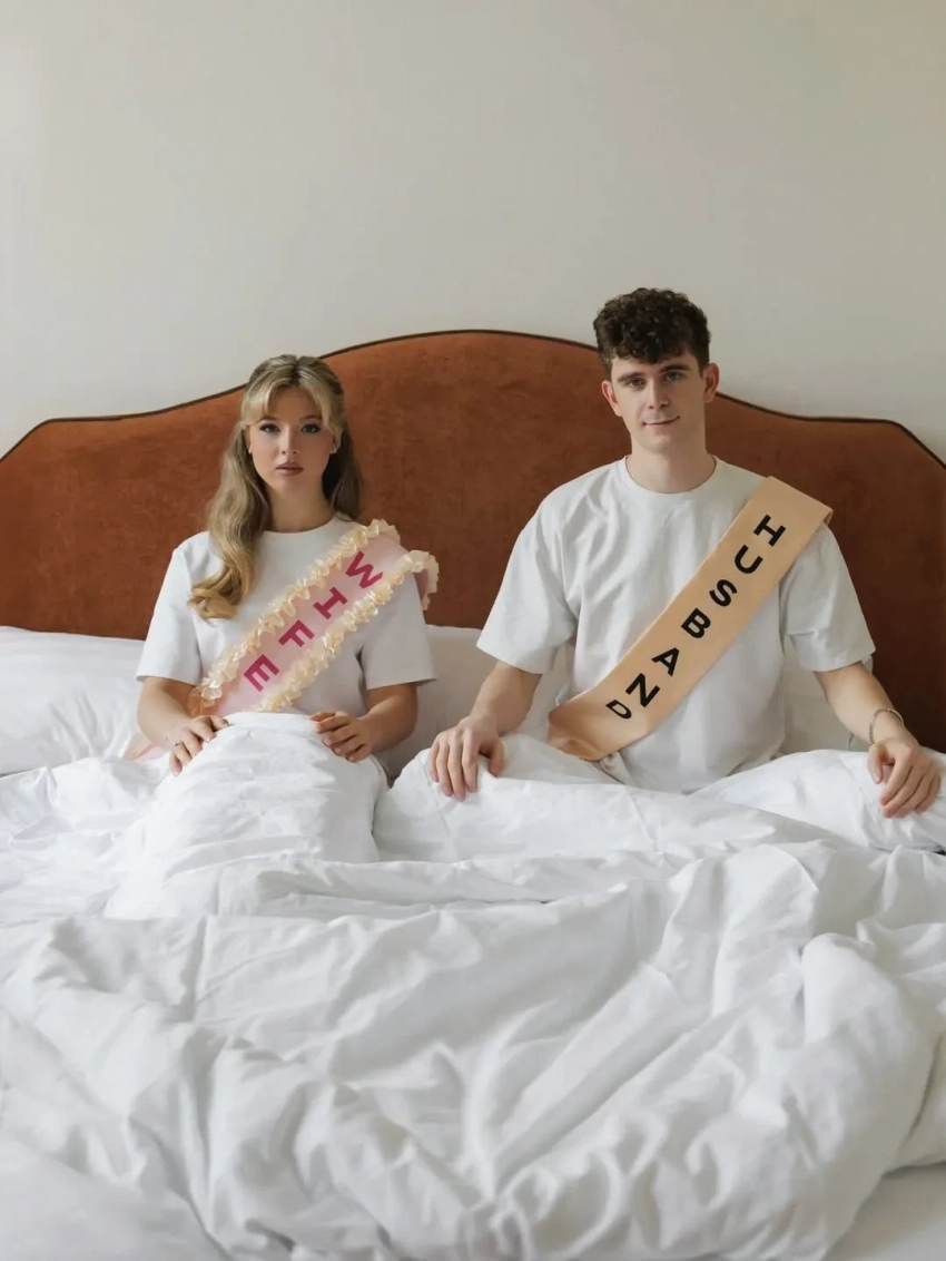Блогеры Аня Покров и Артур Бабич, которые поженились 6 апреля, на следующее утро выложили в инстаграме* необычную фотосессию. Вместо более праздничных нарядов молодожёны выбрали простые футболки и ленты с надписями "муж" и "жена".