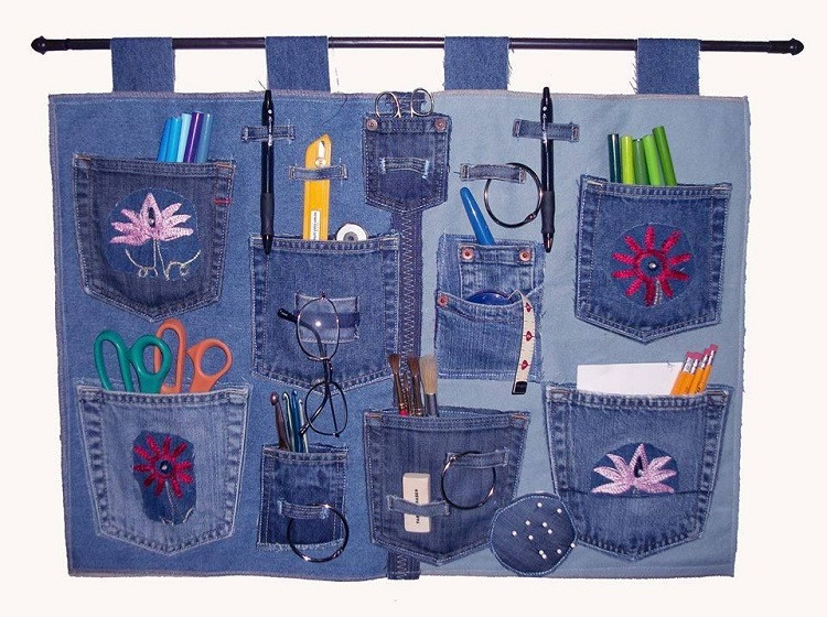 Используйте старые джинсы для создания органайзера на стену или дверь. Вырежьте карманы и прикрепите их к куску ткани или плотного картона. Теперь у вас есть стильное место для хранения мелочей — от ручек и кисточек до косметики и аксессуаров.