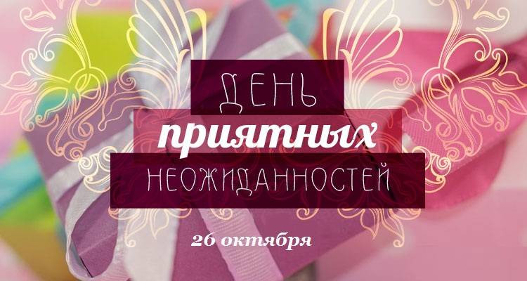 Каждый год 26 октября отмечается Праздник приятных сюрпризов. Точная дата возникновения этого праздника и его создатель остаются неизвестными. Лучше всего заранее подготовиться к этому дню. Узнайте у своих друзей и близких, что они хотели бы получить, и дайте им знать о своих идеях, ненавязчиво сообщив о предстоящем событии. Если подойти к организации с креативностью и умом, этот день станет поистине незабываемым.